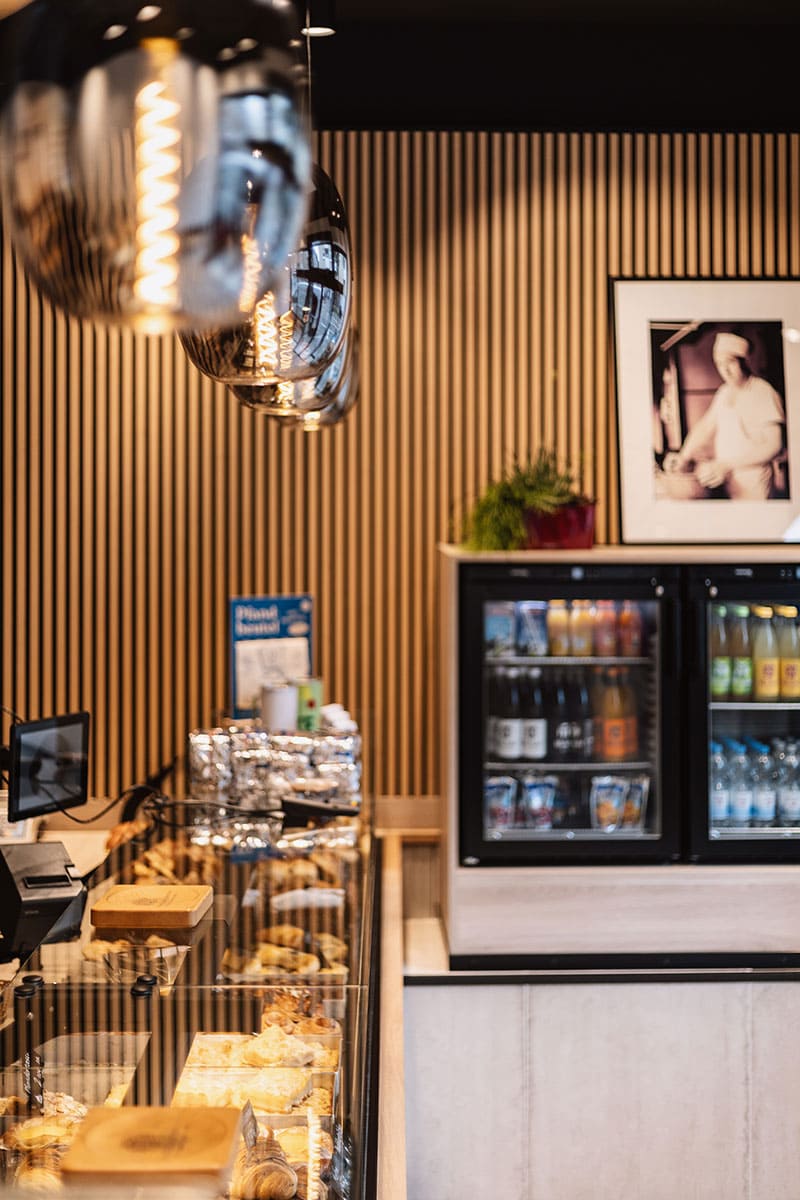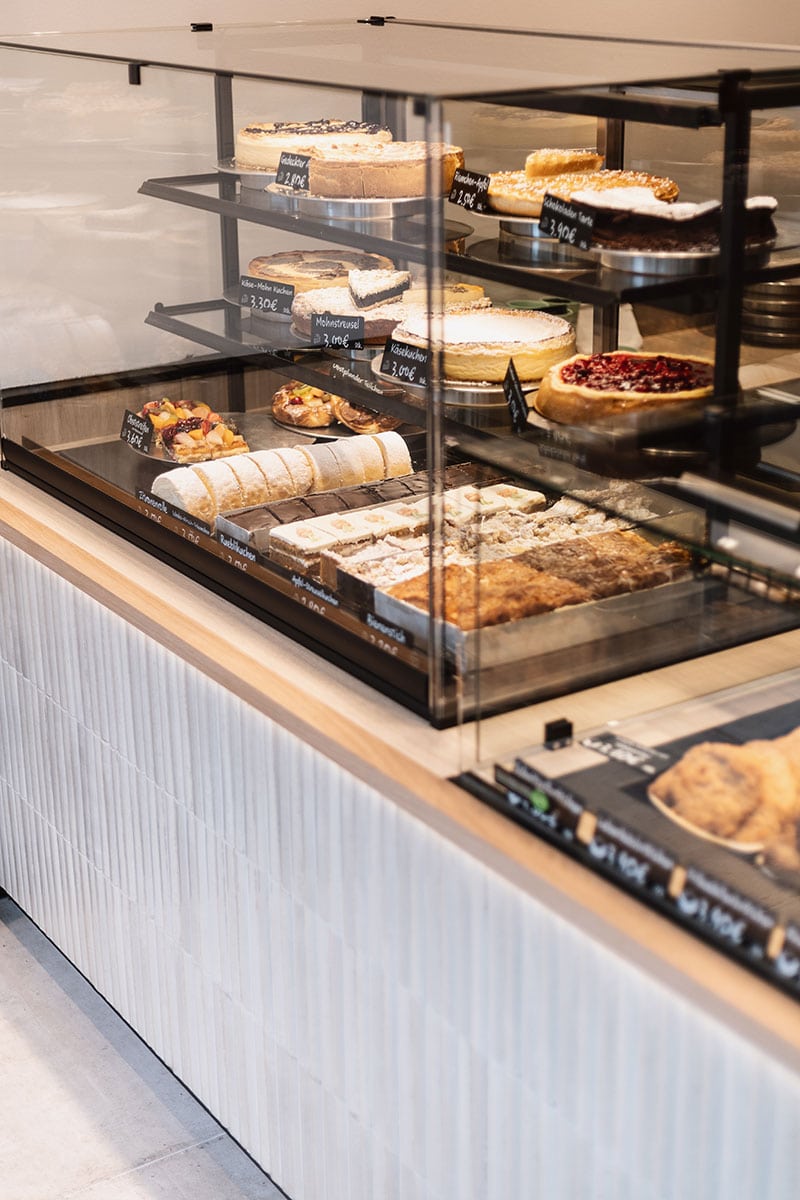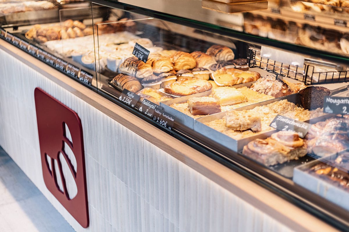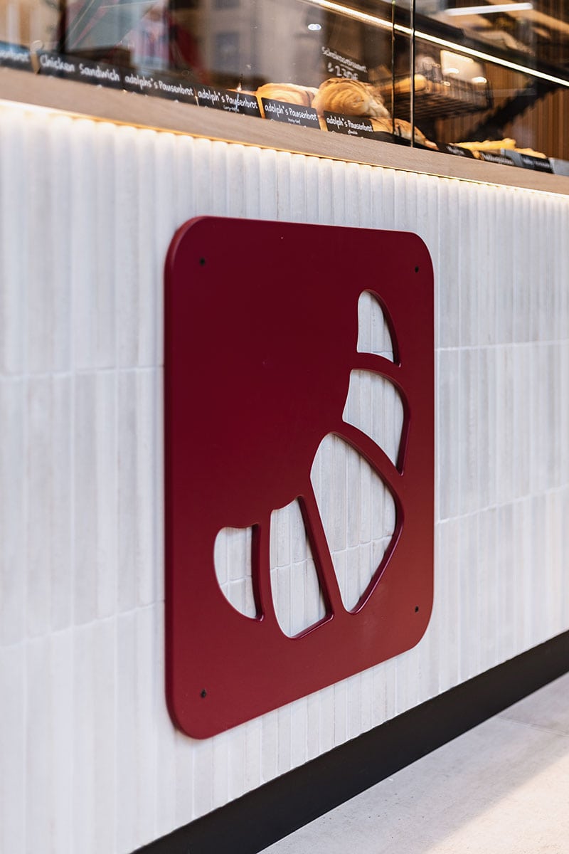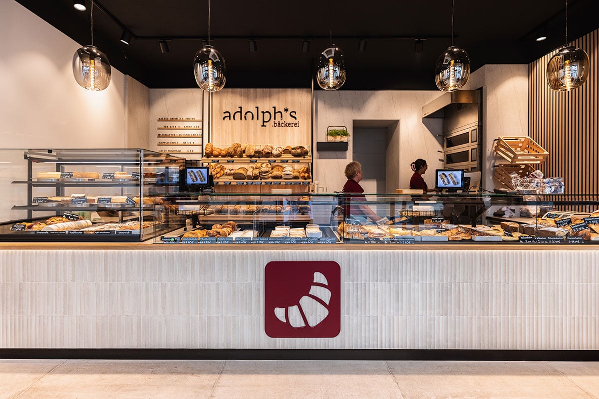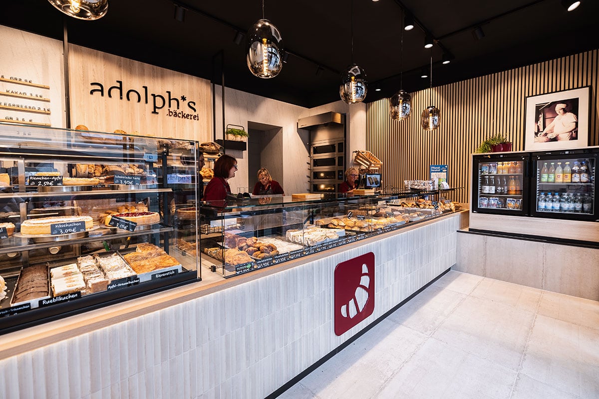 Tradition und Moderne gehen Hand in Hand: Mit dem Umbau ihres Hauptgeschäfts an der Neusser Straße in Köln setzt die Bäckerei Adolph ein starkes Zeichen. Der Familienbetrieb, der seit 1966 das Veedel (Viertel) mit frischem Brot, Brötchen und feinen Konditoreiwaren versorgt, präsentiert sich heute mit einem neuen, zukunftsweisenden Ladenkonzept. Die neue, barrierefreie Tür- und Schaufensteranlage öffnet den Raum und macht den Zugang für alle Kundinnen und Kunden bequem. Durch die geöffnete Decke wirkt das Geschäft höher und großzügiger, während das minimalistische Einrichtungskonzept Ruhe und Klarheit ausstrahlt. Im Mittelpunkt steht die moderne Verkaufstheke mit Relieffliesen in Stäbchenoptik, dreietagiger Kühlvitrine sowie leicht zu reinigender Front- und Zahlscheibe. Hier finden Kuchen, Snacks und Torten ebenso ihren Platz wie frische Brötchen. Ein elegantes Brotregal im Hintergrund rückt das Herzstück des Sortiments ins beste Licht, überhöht durch den Logoschriftzug. Das Beleuchtungskonzept setzt bewusst auf Strahler, die die Backwaren appetitlich in Szene rücken, während dekorative Pendelleuchten den Raum optisch veredeln. Ergänzt wird die Ausstattung durch ein Akustik-Leistenpaneel sowie praktische Lösungen wie den auf Podesthöhe platzierten Kühlschrank. Mit diesem neuen Auftritt bleibt Adolph’s seiner Philosophie treu: echtes Handwerk, beste Qualität und Nähe zum Veedel – verpackt in ein modernes Raumkonzept, das begeistert.