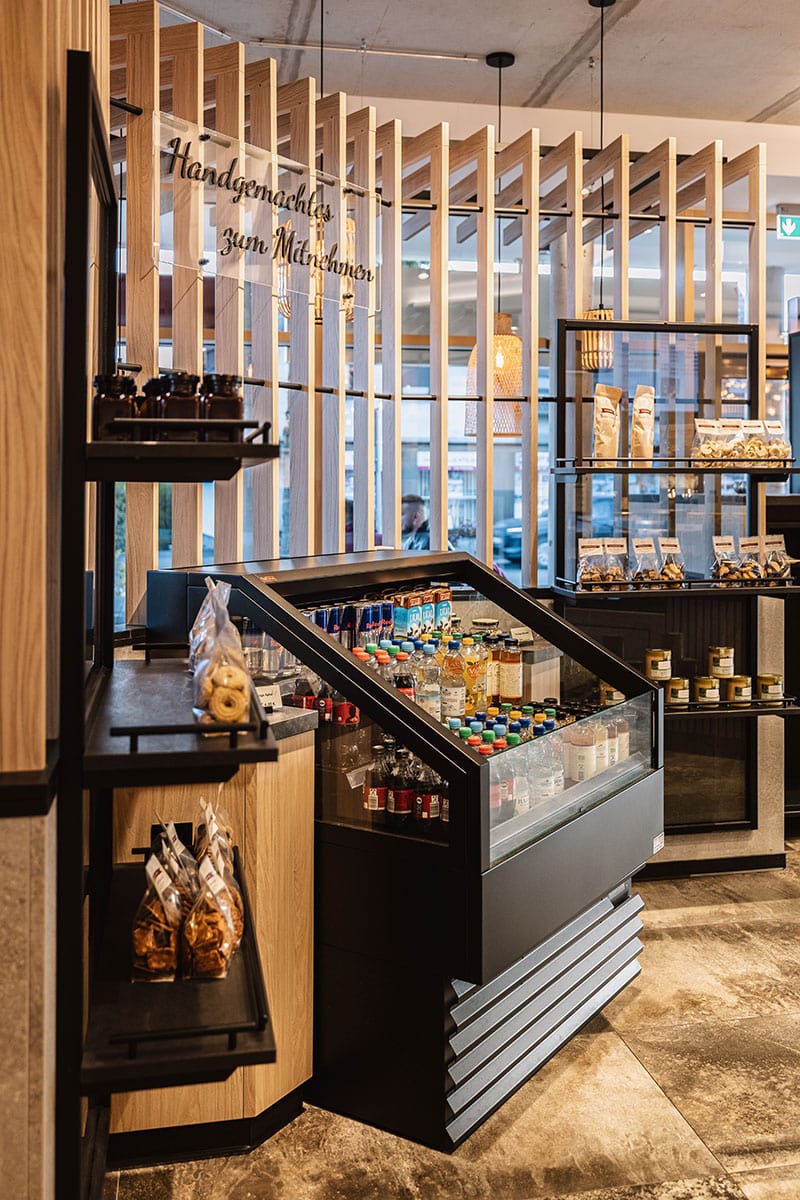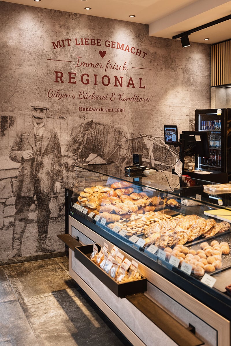 Auch die Wurzeln der Bäckerei sind präsent: Zwei großformatige Tapeten erzählen die Geschichte des Unternehmens – mit Abbildungen des Stammhauses und eines Gründerportraits samt Kutschenpferd. So wird Vergangenheit im neuen Ambiente sichtbar. Grüne Akzente an der Decke verleihen dem Raum eine natürliche Note. Durchdachte Details wie die Selbstbedienungsecke mit integrierter Getränkekühlung runden das Konzept ab und machen den Einkauf schnell und unkompliziert. So ist in Ittenbach ein Ort entstanden, der mehr ist als eine Verkaufsstelle: ein modernes Café mit Charakter, das Handwerkskunst, Geschichte und Wohlfühlatmosphäre gekonnt vereint.