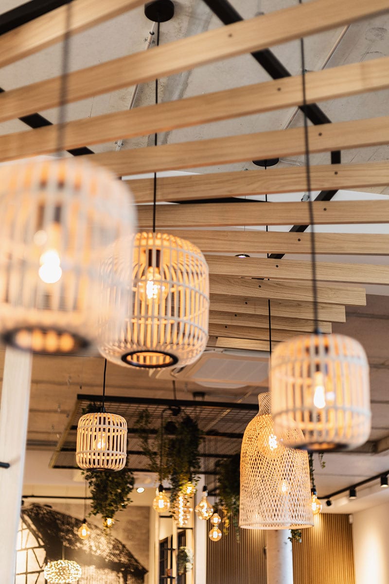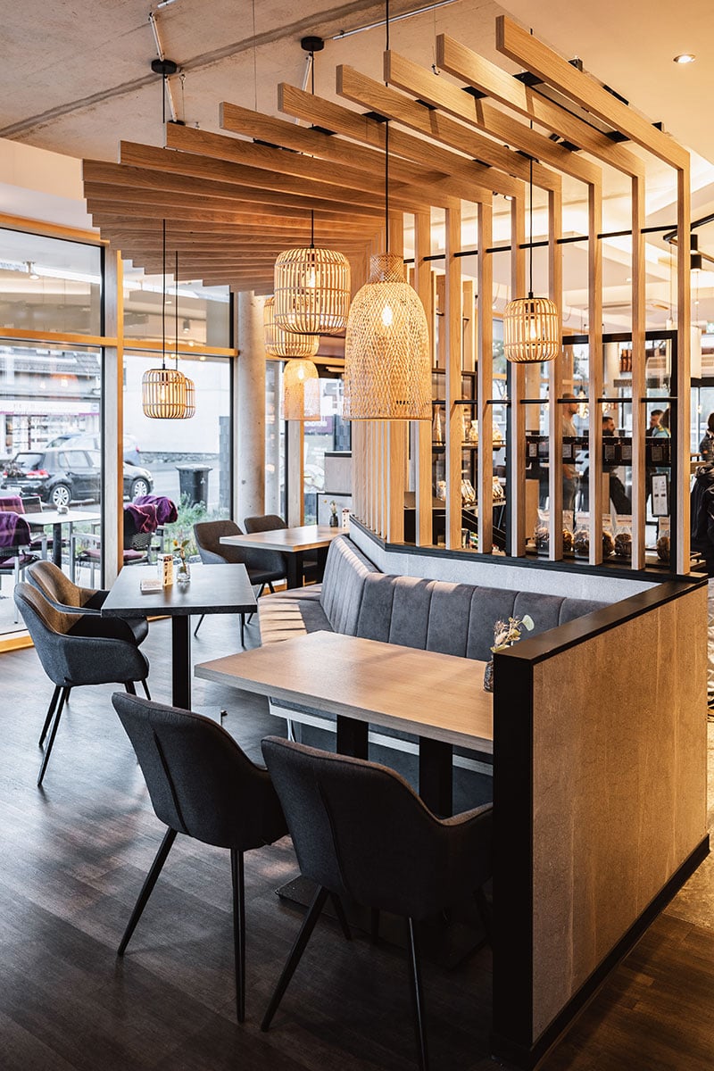 Mit der neuen 43. Filiale an der Königswinterer Straße 309 ist die Bäckerei Gilgens erstmals in Ittenbach vertreten. Walterscheid Geschäftseinrichtungen hat dafür ein modernes und zugleich gemütliches Gestaltungskonzept entwickelt, das die regionale Verbundenheit des Familienunternehmens spürbar macht. Helle Eiche, grau marmorierte Steinflächen und eine lockere Leisten-Paneeloptik prägen das Erscheinungsbild. Besonders ins Auge fällt die abgewinkelte Sitzbank, die mit einem markanten Raumtrennelement in Bretteroptik und warmen Bambus-Leuchten zu einem gemütlichen Mittelpunkt wird.