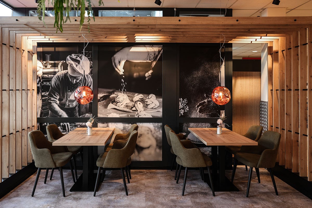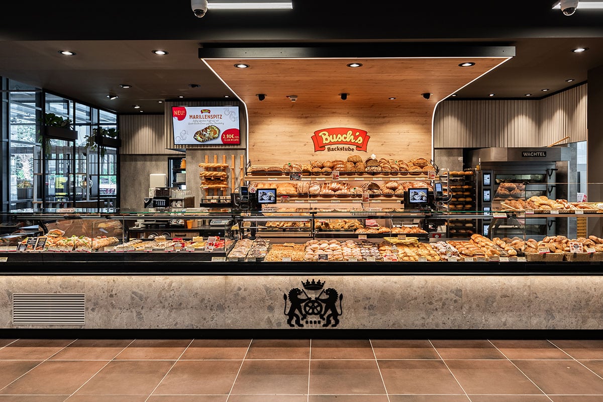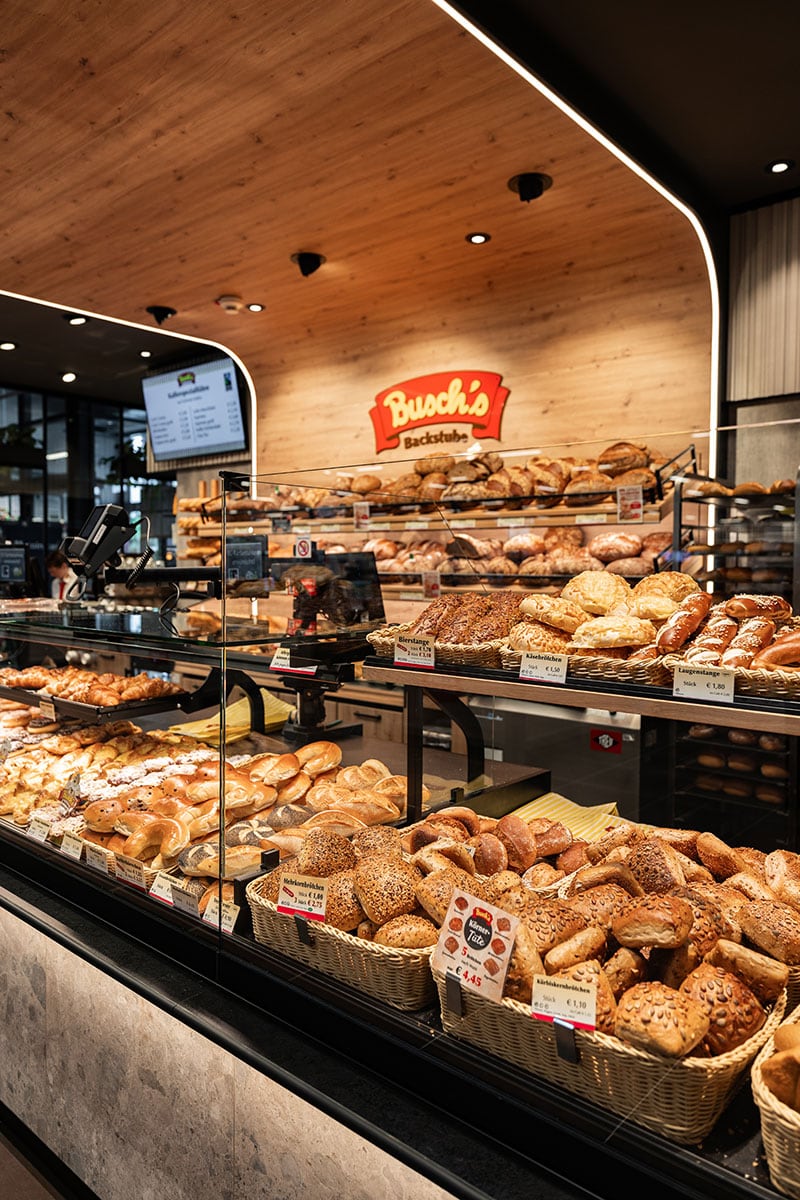 Der neu gestaltete Sitzbereich punktet mit durchdachter Raumwirkung: Eine kleine Häuschen-Nische bietet geschützten Platz für eine entspannte Auszeit. Großformatige Wandgrafiken in Betonoptik und dekorative Leuchtringe mit Begrünung setzen visuelle Highlights und schaffen eine moderne, einladende Atmosphäre. Parallel zum Neubauprojekt in Baumberg wurde auch der Sitzbereich der bestehenden Busch-Filiale im REWE Erkrath modernisiert. Die Einrichtung stammte aus dem Jahr 2014 und entsprach nicht mehr den aktuellen Anforderungen. Neben einer umfassenden Neugestaltung des Cafébereichs wurde die Thekenanlage um eine zusätzliche Snacktheke erweitert – als Reaktion auf die wachsende Nachfrage nach To-go-Angeboten. Auch hier haben wir das neue Erscheinungsbild der Bäckerei konsequent umgesetzt. Zwei Projekte, die zeigen: Durchdachte Funktionalität, hochwertiges Design und kundenorientierte Lösungen können im Ladenbau eine starke Verbindung eingehen.