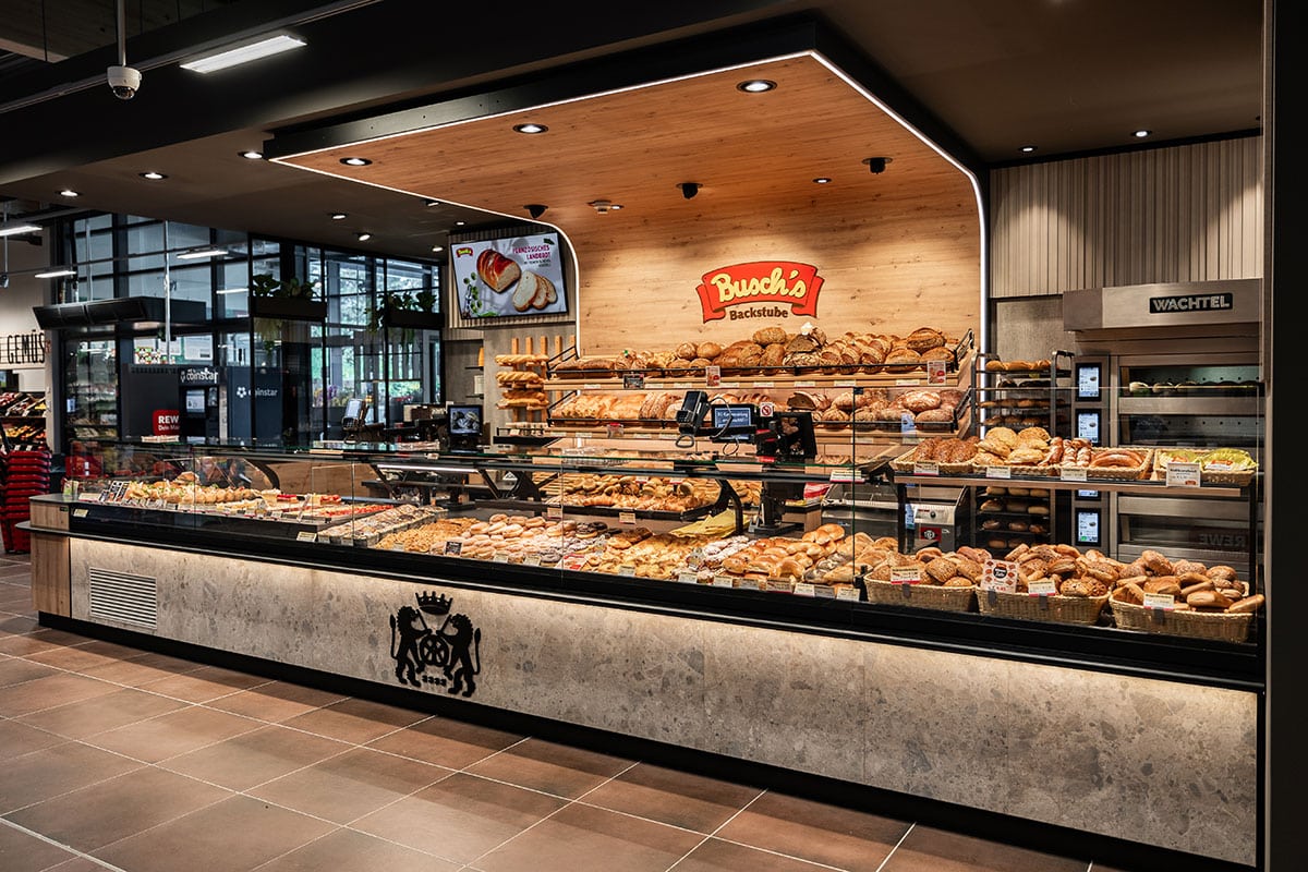 Mit dem Neubau der Filiale in Baumberg erhielt auch die Bäckerei Busch einen völlig neuen Auftritt – konzipiert und umgesetzt von Walterscheid Geschäftseinrichtungen. Die neue Filiale befindet sich in der großzügig gestalteten Vorkassenzone des REWE-Marktes innerhalb eines neu entstandenen Gewerbekomplexes, der neben REWE auch einen Lidl-Markt sowie Büro- und Praxisräume umfasst. Das neue Erscheinungsbild der Bäckerei vereint zeitgemäßes Design mit starker visueller Präsenz. Astige Eiche und Terrazzo-Fliesen in der Thekenfront sorgen für eine warme, natürliche Wirkung. Die gebogene Holz-Rückwand mit ihrer umlaufenden LED-Beleuchtung setzt nicht nur das Sortiment effektvoll in Szene, sondern definiert den gesamten Verkaufsbereich atmosphärisch. Gemeinsam mit der durchdachten Deckenbeleuchtung entstand ein stimmiges Lichtkonzept, das Struktur verleiht und das hochwertige Ambiente unterstreicht. Auch im Detail zeigt sich die Verkaufszone funktional und praxisgerecht – mit einer leistungsstarken Thekenanlage im Zentrum.