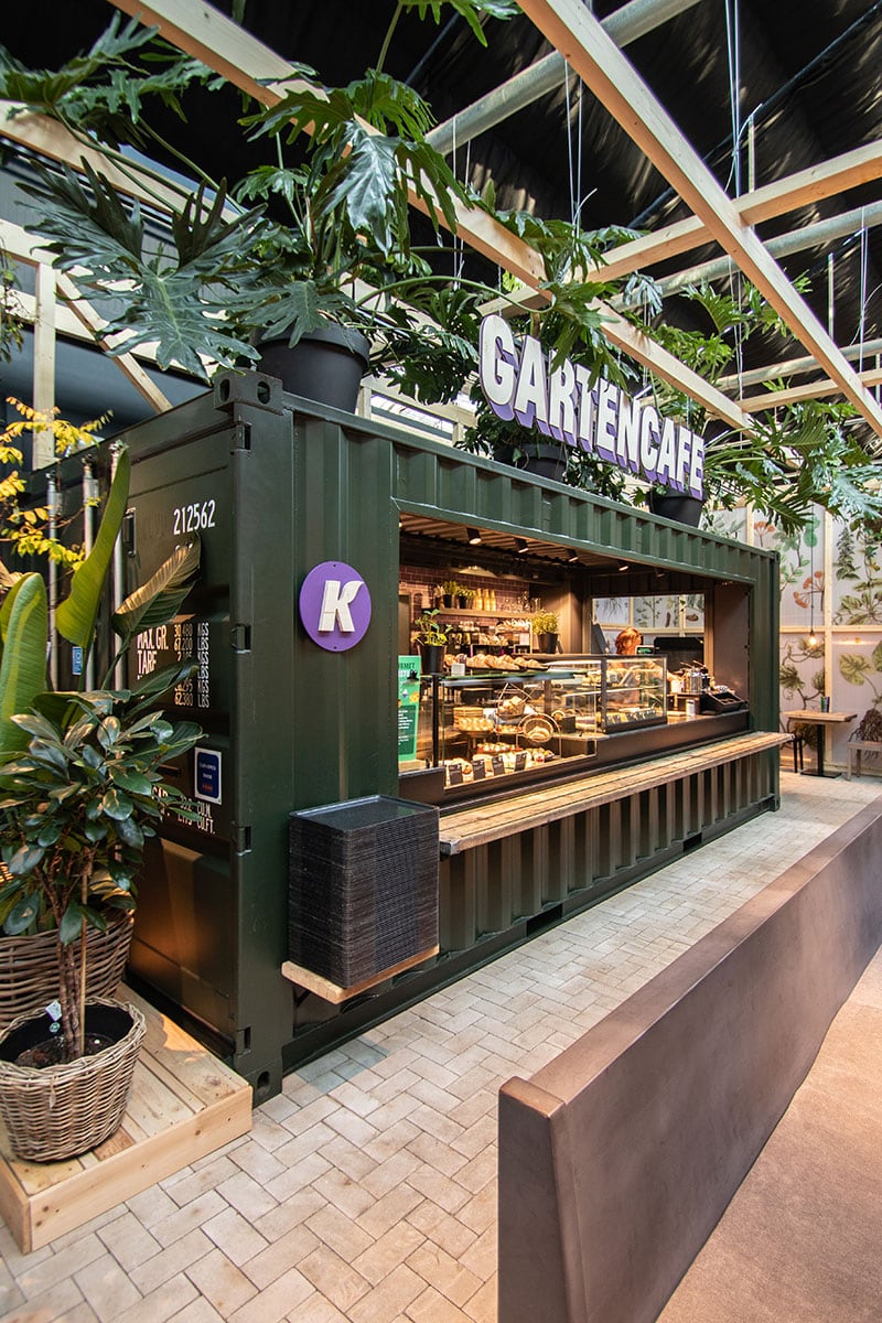 Im Zuge der Neugestaltungen der Gartencenter Kremer in Lüdenscheid und Remscheid durfte die Walterscheid Projektschmiede Teil eines außergewöhnlichen und einzigartigen Ladenbau- Projektes werden. „Grüntopia“ wie sich das, von der Designagentur nexd in Zusammenarbeit mit Familie Kremer, geschaffene Storekonzept nennt, beinhaltet mehrere themenspezifische Abteilungen, in denen den Kunden ein grüner, urbaner Lifestyle als Miteinander von Mensch und Pflanze vermittelt wird. Einer dieser sehenswerten Teilbereiche beinhaltet den sogenannten Food-Markt. Hier hat der Kunde /die Kundin die Möglichkeit verschiedene Speiseangebote zu genießen, von denen ein Großteil der verwendeten Zutaten praktischerweise gleich Nebenan im Gartencenter heranwächst. Produziert und präsentiert werden die unterschiedlichen Gerichte in originell gestalteten und clever ausgebauten Überseecontainern.