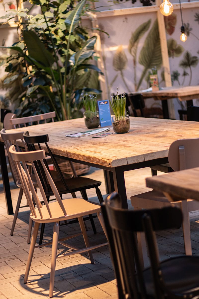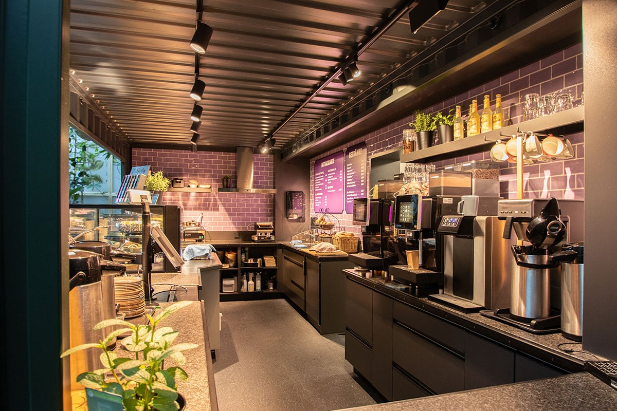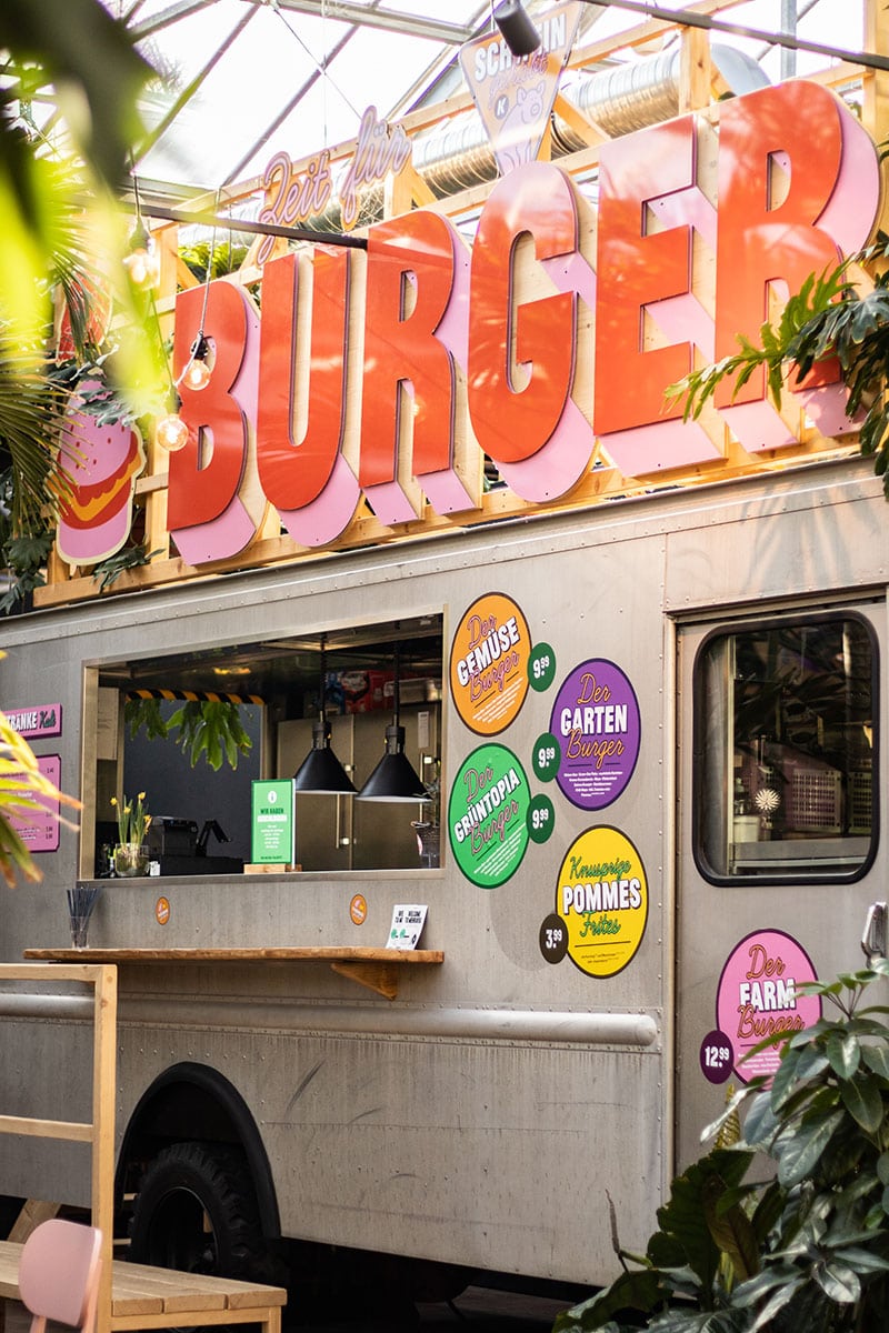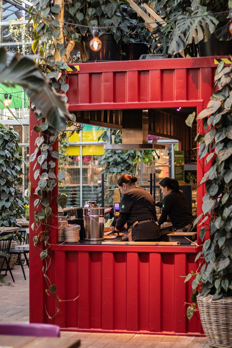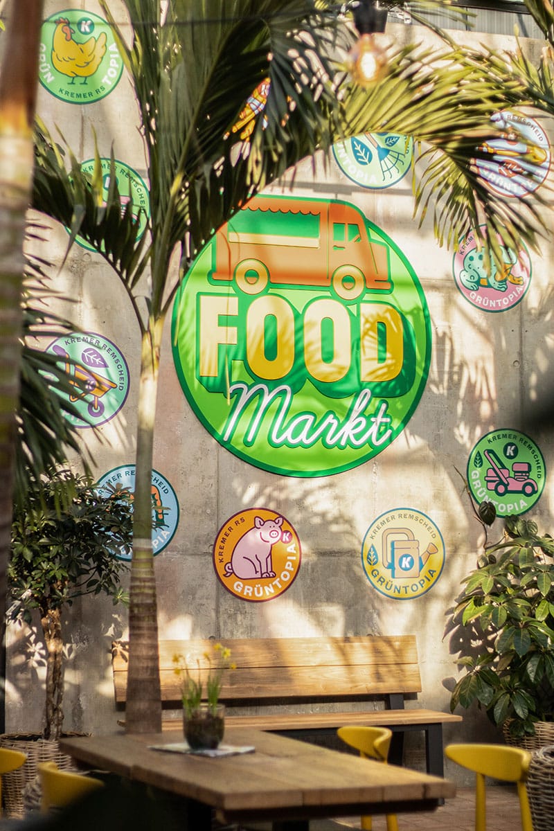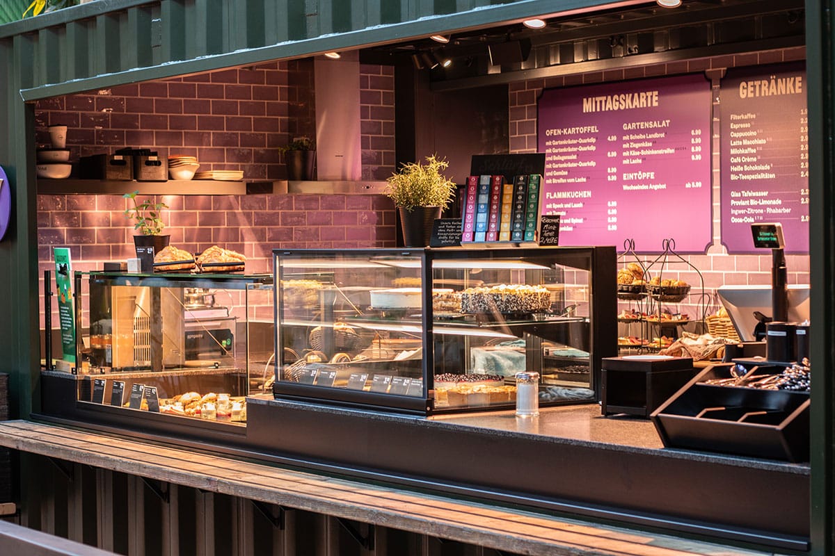 Auf der kleinen Grundfläche der ausrangierten Container hat die Walterscheid Projektschmiede eine ganzheitliche Verkaufsfläche geschaffen, die die Produkte perfekt in Szene setzt und einen reibungslosen, funktionalen Arbeitsraum für das Personal bietet. Von außen sind die Container (dem neuen Gestaltungskonzept angepasst) farbig gestrichen und oberhalb mit großflächigen Pflanzen und bunten Beschilderungen versehen. Der Verzehrbereich spiegelt diese Farbkombinationen wieder und wird durch Tische aus alten Baudielen kontrastiert. Zusammen mit der eindrucksvollen Bepflanzung im gesamten „Food-Markt“ ist hier das nächste Instagram-reife Foto garantiert!