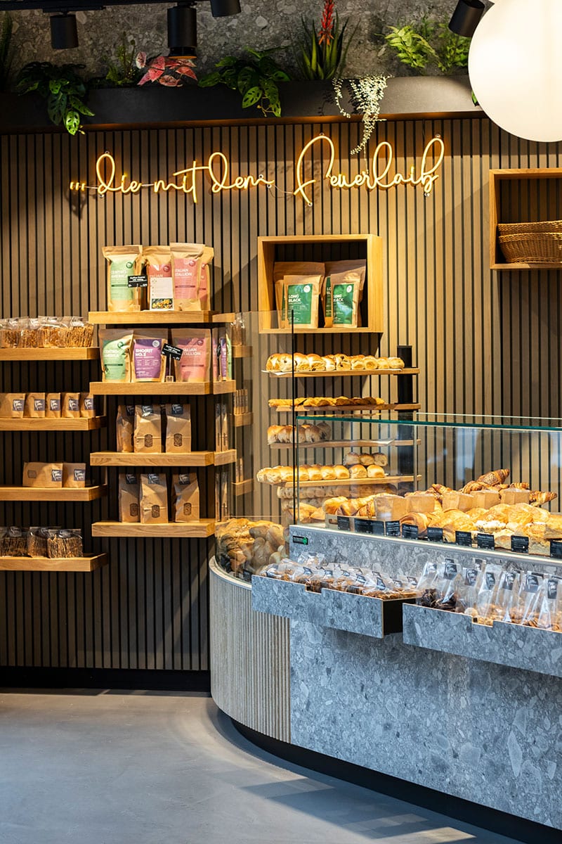 Mit diesem „Natural Design – Konzept“ beweist die Walterscheid – Projektschmiede einmal mehr ihre Kompetenz als Spezialist für individuell geplante Gesamtlösungen bei der Vermarktung und Inszenierung handwerklich gefertigter Backwaren. Für die neue panpan Brotmanufaktur in Bielstein kreierten Dipl.-Designer Andre Walterscheid und Kundenberater Schwanewilm ein stylisches Konzept, welches Jung und Alt anspricht. Einbauten und Exponate in Eiche Massivholz und gesintertem Stein, kombiniert mit dekorativen Pflanzen laden zu einer Pause im hektischen Arbeitsalltag, ob zum Treff mit netten Menschen oder zum Auftanken frischer Kräfte ein. Für Impulskäufe wurde in der geschwungenen, aus modernem Terrazzo-Stein gearbeiteten Thekenfront ausgefräste Schubkästen integriert.