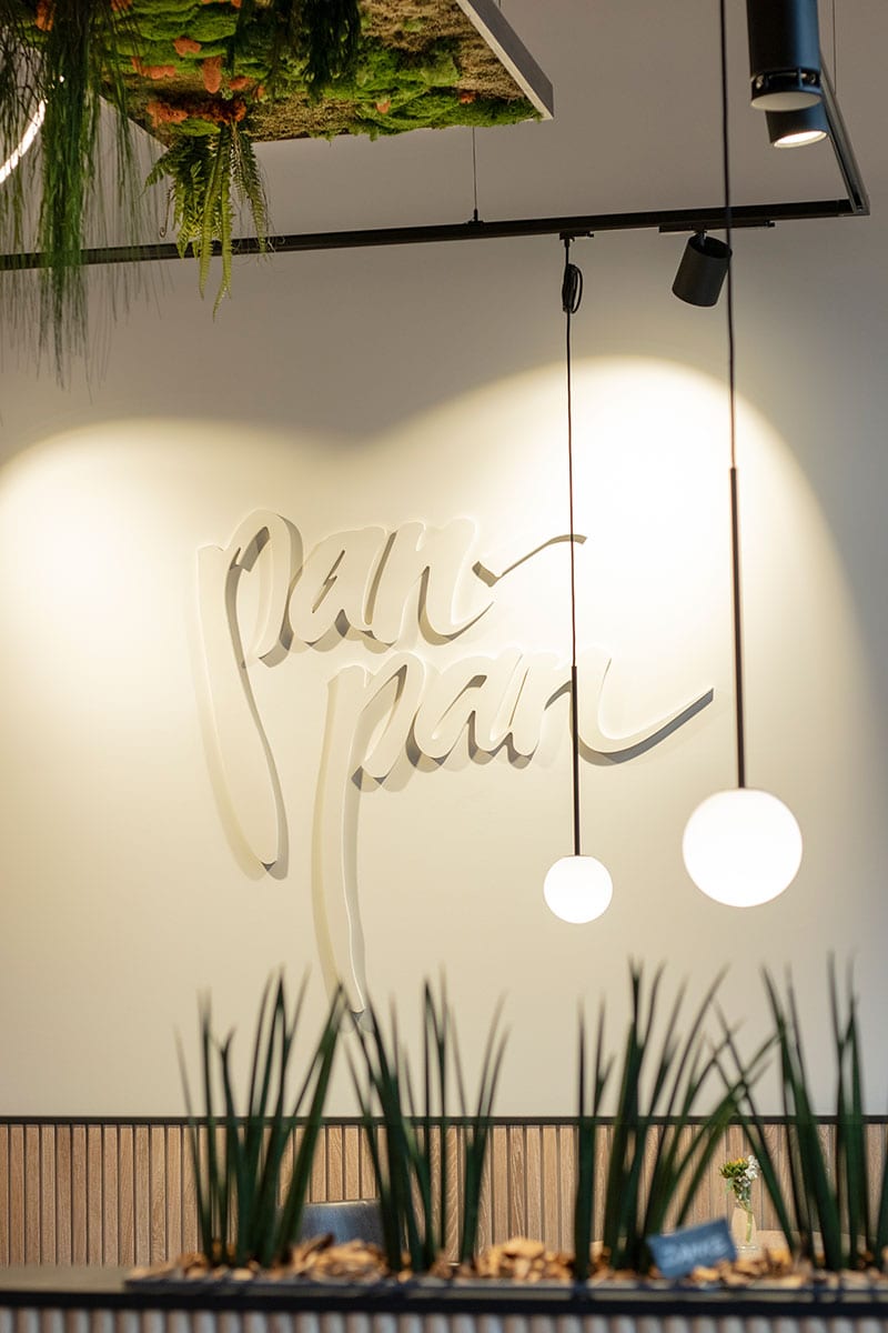 Angelehnt an bekannte Kleingebäck – Präsentationen aus französischem Patisserien sorgt ein flexibler Backwarenturm als Präsenter für Aufmerksamkeit. Mit dunklen Untergrundrosten dient die bekannte Walterscheid – Brotwand als Highlight für das beliebte panpan „Feuerlaib“. Elegante Kugelleuchten schaffen eine stimmige Ausleuchtung im Thekenbereich. Die von der Decke abgehangene „Pick-up Station“ dient künftig für Vorbestellungen über eine App, die sich derzeit noch in der Entwicklung befindet. „Bike-Map“ als Eyecatcher im gemütlichen Sitzbereich weist auf die bekannte und beliebte Fahrrad-Region hin. Ein moderner Lichtschlauch und die begrünten Deckensegel, runden das Gesamtbild perfekt ab. Ein perfekter Start für panpan in Bielstein, denn gutes Design verbindet Funktionalitäten mit Emotionen.