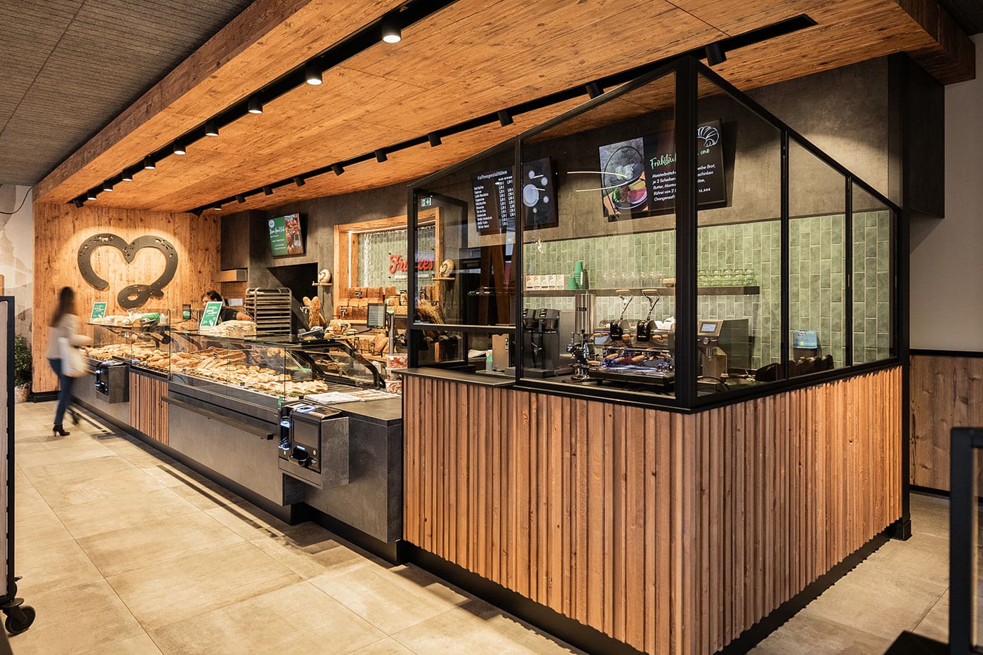 Mit der neuen Bäckerei Franzes an der Rönkhauser Straße 70 in Arnsberg Müschede ist ein modernes und gleichzeitig heimeliges Ladenkonzept entstanden. Innerhalb von nur neun Monaten wurde der einladende Freestander an einer stark frequentierten Straße geplant und realisiert – von der ersten Idee bis zur Eröffnung. Das Gestaltungskonzept, entwickelt von Diplom-Designer Andre Walterscheid und umgesetzt durch Projektleiter Tobias Schwanewilm, vereint natürliche Materialien mit modernen Akzenten. Holz in rustikaler Optik trifft auf klare Linien und durchdachte Strukturen – inspiriert von der Natur des Sauerlands. Die Wandgestaltung mit Waldmotiven und sanften Farbnuancen verstärkt das Gefühl von Heimatverbundenheit. Herzstück der Bäckerei ist die großzügige Theke, die die Vielfalt der Backwaren optimal in Szene setzt. Ergänzt wird sie durch die Walterscheid Brotarena, die den Fokus auf das Brot als zentrales Produkt lenkt. Der Sitzbereich, durch stilvolle Holzlatten aufgelockert, bietet den Gästen Rückzugsorte zum Genießen und Verweilen. Begrünungselemente runden das Raumkonzept ab und schaffen eine angenehme Wohlfühlatmosphäre. Wir freuen uns, dieses besondere Projekt gemeinsam mit der Bäckerei Franzes umgesetzt zu haben, und bedanken uns für das Vertrauen in unsere Arbeit.