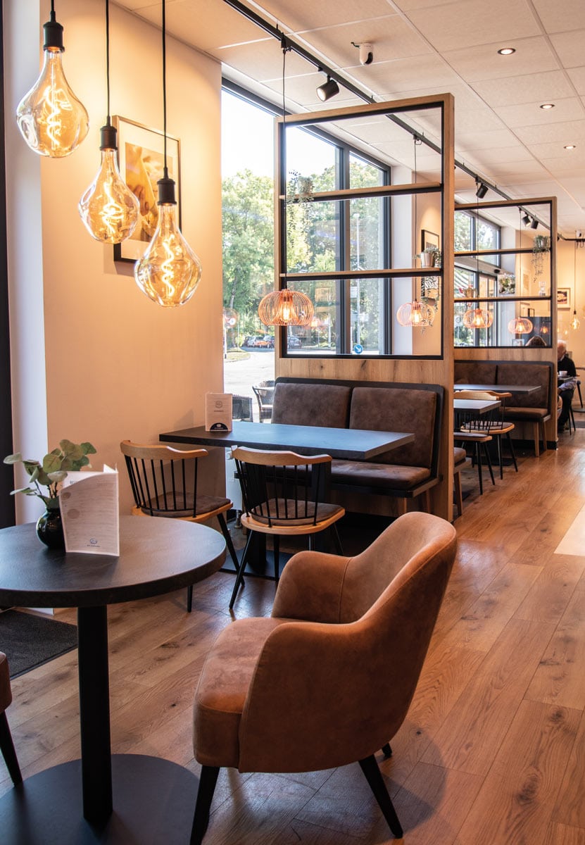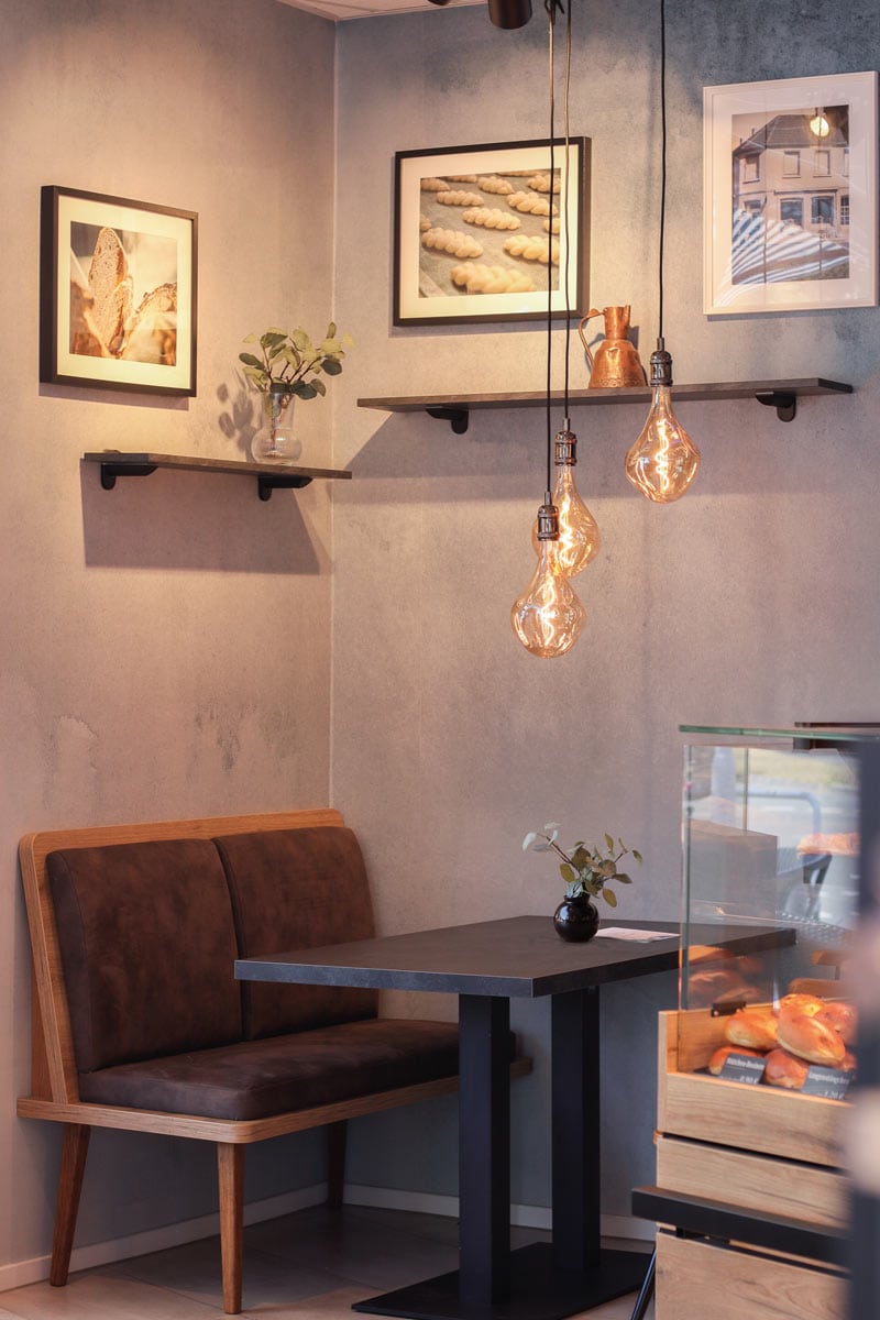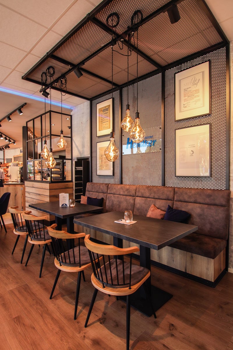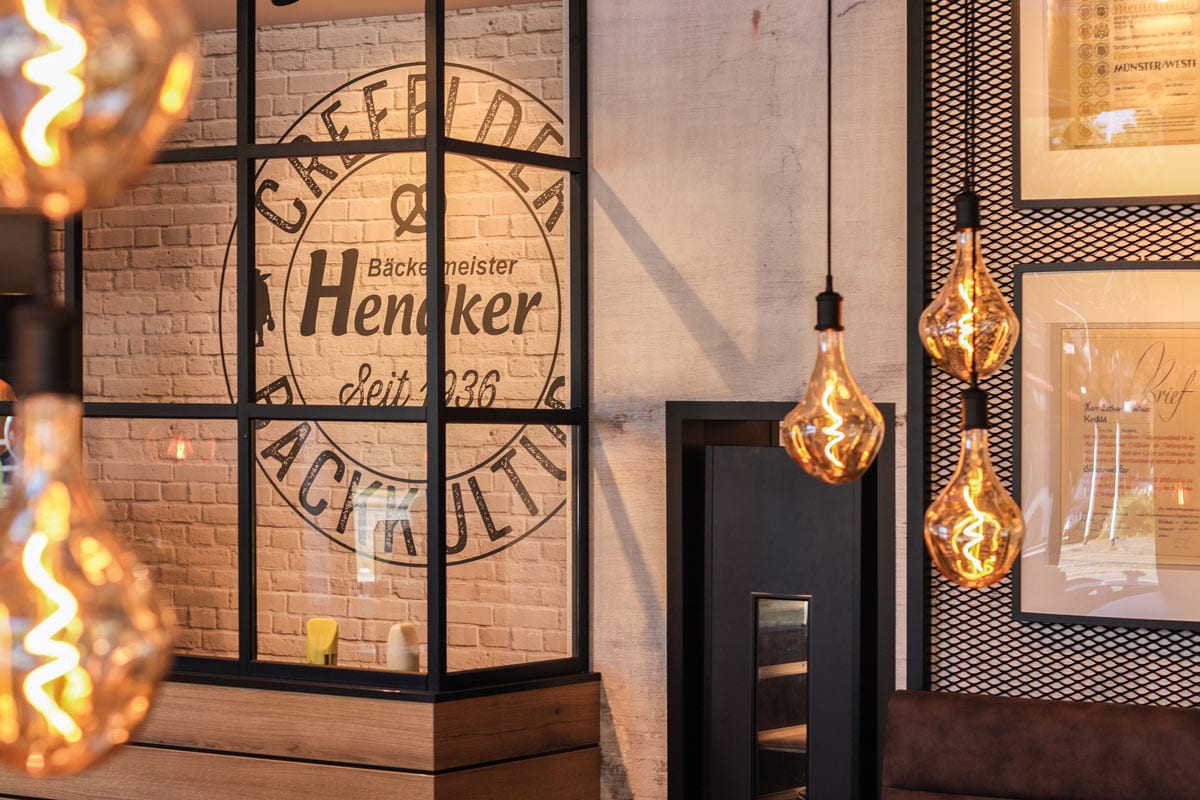 Nach Anmietung benachbarter Geschäftsräume am bisherigen Standort und umfangreichen Umbauarbeiten entstand in der Krefelder Moerserstraße der neue Flagshipstore – ein Brot- und Kaffeehaus – der Bäckerei Hendker mit seinen 7 Filialen. Die hochwertige und großzügig gestaltete neue Filiale vereint 2 Schwerpunkte unter einem Dach: Bäckerkompetenz und Wohlfühlatmosphäre. In enger konstruktiver Zusammenarbeit mit der Walterscheid – Projektschmiede und Kundenberater Klaus Wiermann wurde auf 160 qm ein modernes Raumkonzept im Industrie-Design realisiert. Den Gast empfängt eine Wohlfühlatmosphäre und 44 Sitzgelegenheiten – von Lounge-Möbeln bis zur gemütlichen Bank – um im modernen Bäckerei-Café Kuchen, Torten und andere Köstlichkeiten aus eigener Herstellung zu genießen. Großzügig dimensioniert ist auch die 8 mtr. messende Thekenanlage inkl. Tortenvitrine mit einer Backwarenpräsentation zum Anbeißen. Bei der Einrichtung wurde Blau als Farbe des Firmenlogos durch unterschiedliche Gestaltungselemente – wie bei der Polsterung der Sitzmöbel, den Wandtapeten sowie durch indirekte Beleuchtung – in das Gesamtkonzept integriert. Extravagante Leuchten schaffen Gemütlichkeit und sorgen für eine optimale Fernwirkung.