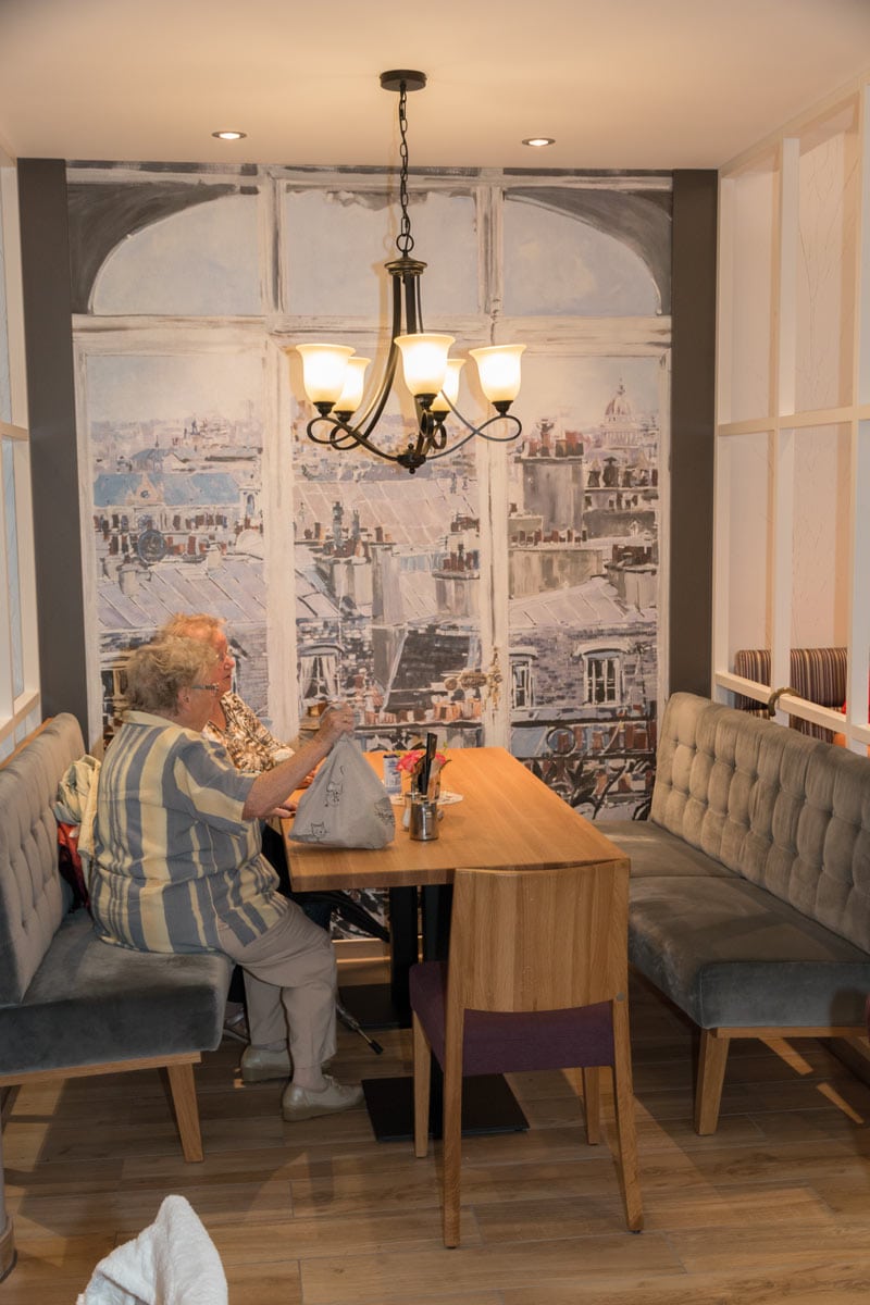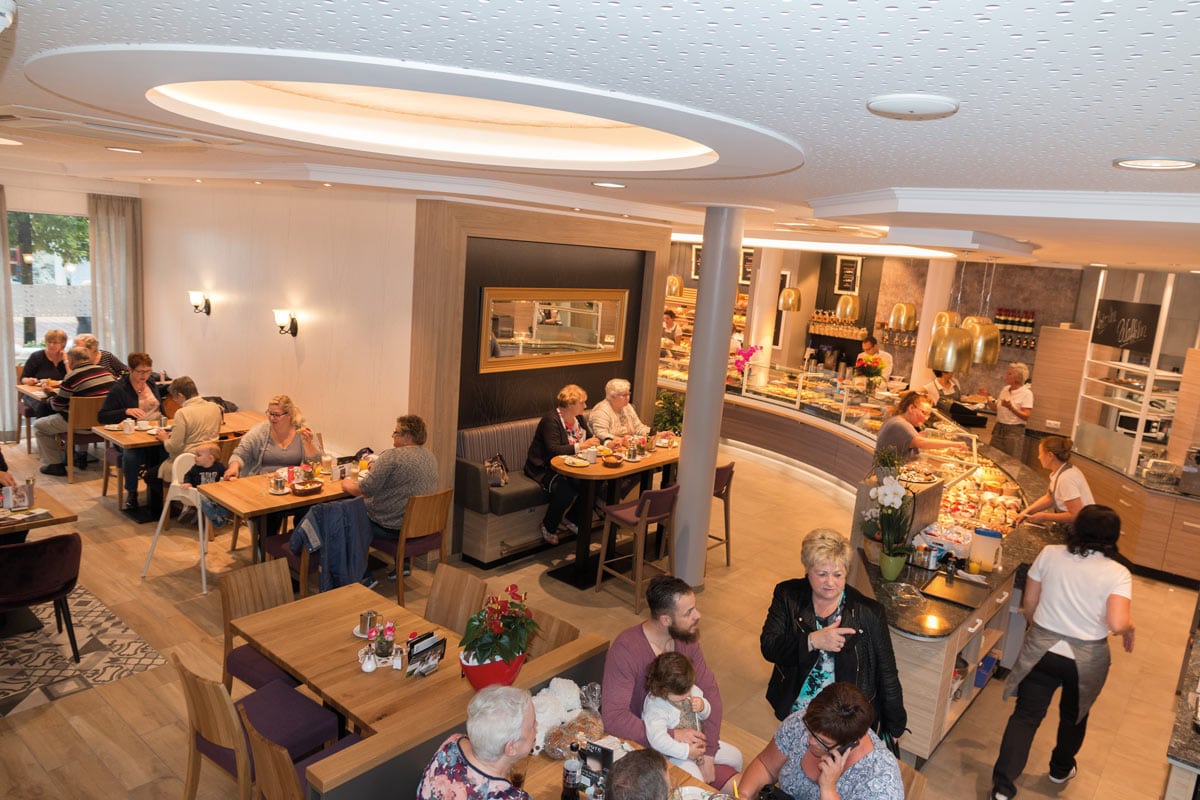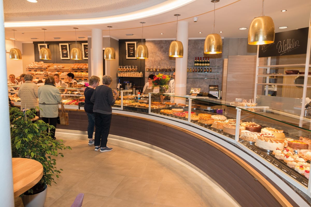 Die Ladenausstattung wurde vom Fußboden bis zur Decke von der Walterscheid – Projektschiede gefertigt und eingebaut, inklusive nahtloser Abstimmung aller erforderlichen Gewerke. Mit einer klaren Untergliederung in die Bereiche Brot und Backwaren, Snackstation, Konditorei und Patisserie sowie der Kaffee- und Heißgetränke – Welt, wird dem Kunden eine übersichtliche Orientierung geboten. Schon beim Betreten des Ladenlokals wird er von einer halbrunden, 11 Meter messenden Thekenanlage empfangen. Mit LED – Lichttechnik und zahlreichen technischen Highlights bietet diese Theke einen perfekten Rahmen und Überblick auf das provozierend vielfältige Warenangebot. Durch eine interessante Raumteilung wird der Kunde nicht von der Größe des Objektes überfordert. Die verschiedenen Sitzbereiche und „Erlebniswelten“ wurden so konzipiert, dass sich Jung und Alt hier gleichermaßen wohlfühlen – egal, ob alleine für einen Latte Macchiato, mit Freunden zum Frühstücksbrunch, zur Mittagszeit mit Kollegen zum Snack oder zum Nachmittag zu Kaffee und Kuchen. Dank des vielfältigen Verzehrangebotes ist das Café bis Ladenschluss stets gut besucht. Dies ist eine Investition in die Zukunft.