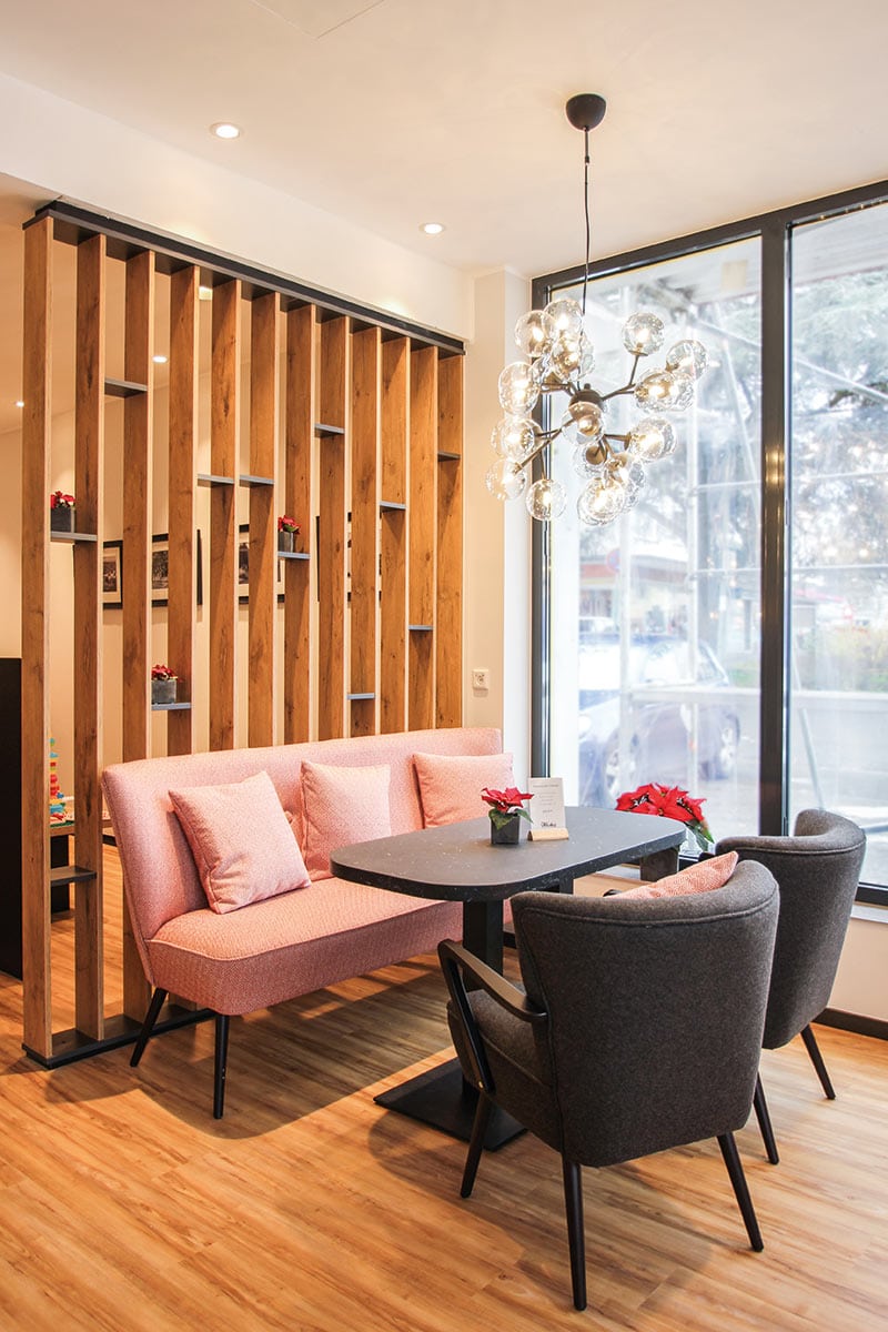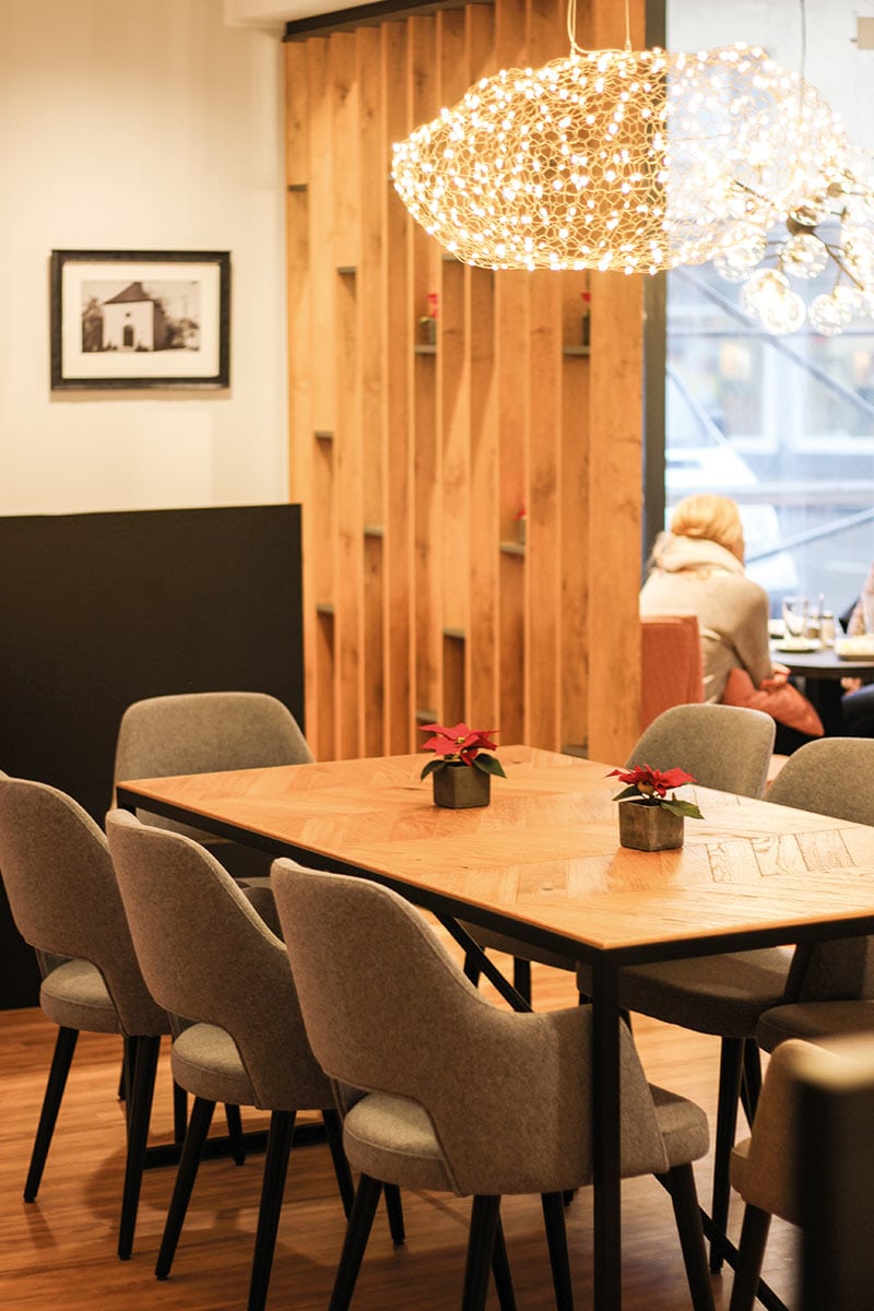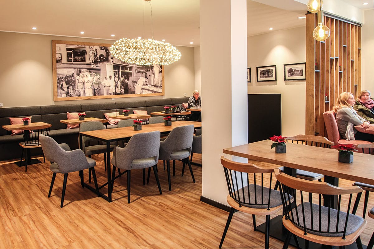 Diese Ideensammlung wurde in eine 3D-Animation übertragen und überzeugte Herrn Kretzer so auf ganzer Linie. Die Schlichtheit der Materialien, die reduzierte Formensprache sowie der gezielte Einsatz von hochwertigen Stoffen, Möbeln und Lampen geben dem Café mit seinen 43 Sitzplätzen einen unverwechselbaren Charakter.