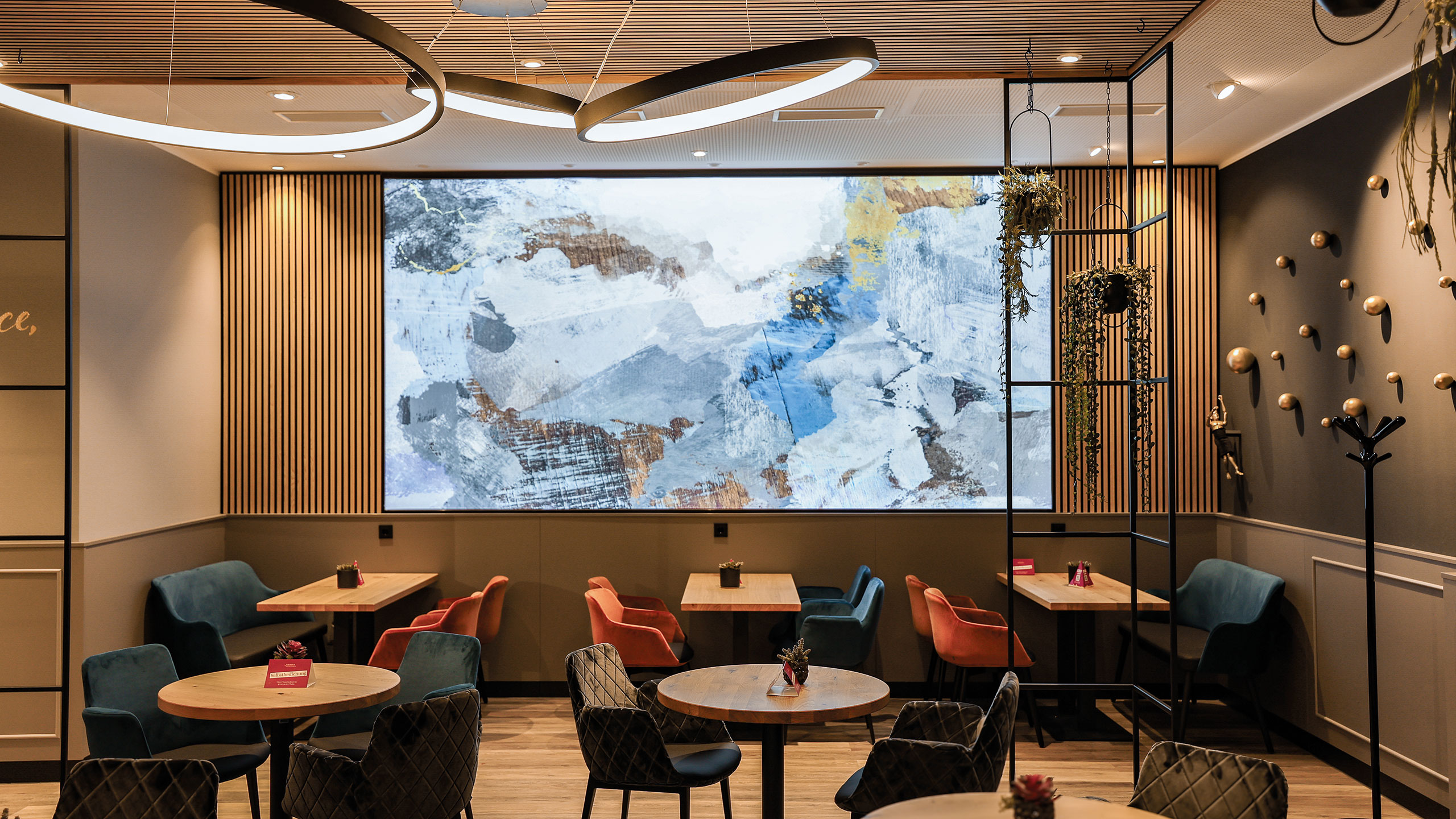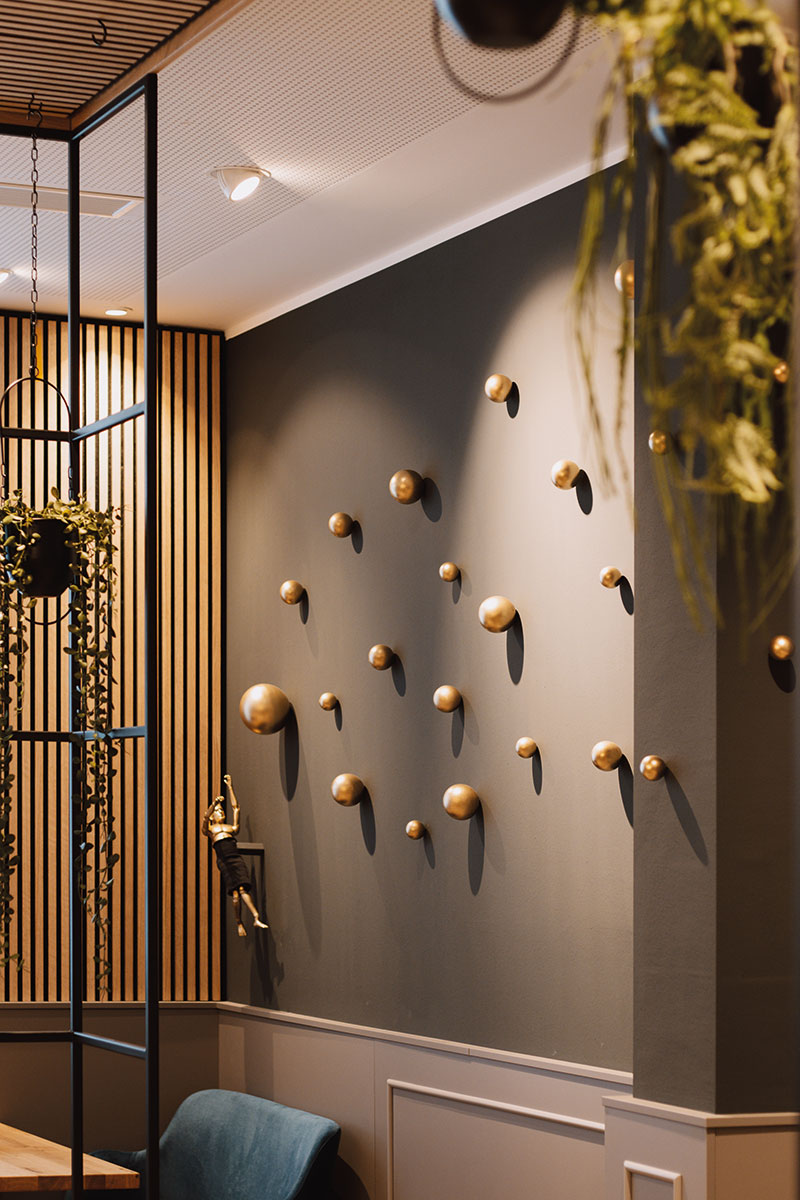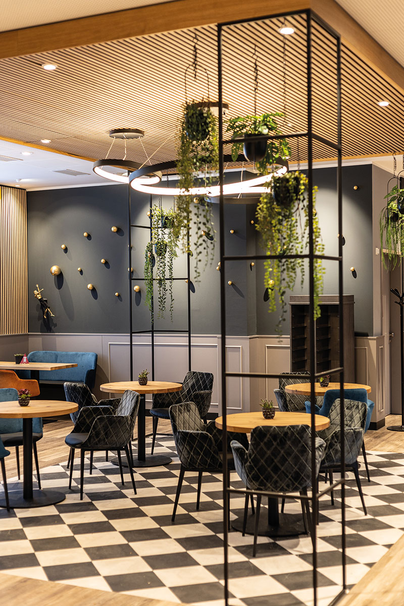 Ergänzt wird der Verkaufsbereich durch eine eigenständig zonierte Caféfläche, die als ruhiger Treffpunkt im Quartier konzipiert ist. Warme Holzoberflächen, Materialien in Betonoptik und eine gezielte Lichtplanung schaffen eine moderne, einladende Atmosphäre.