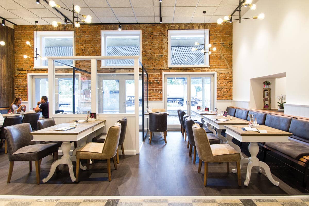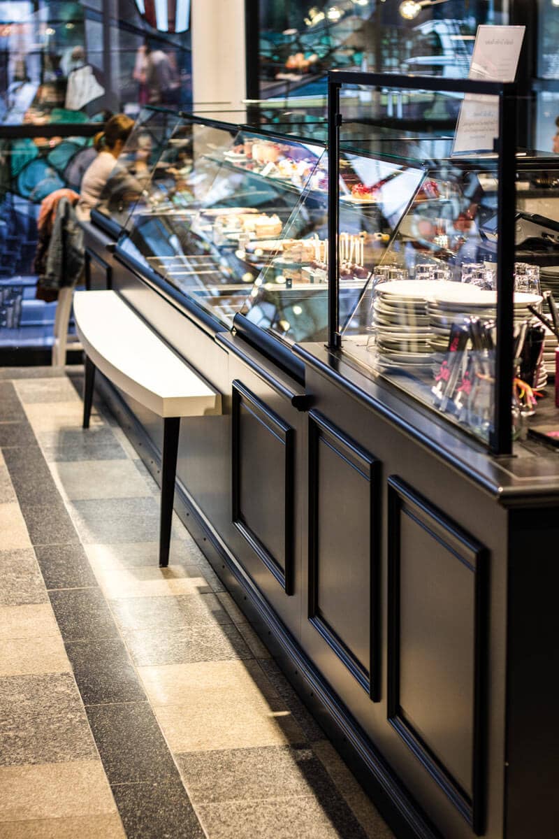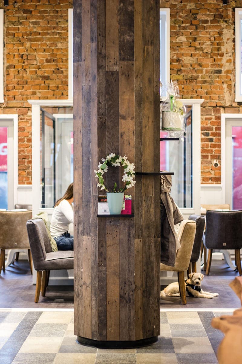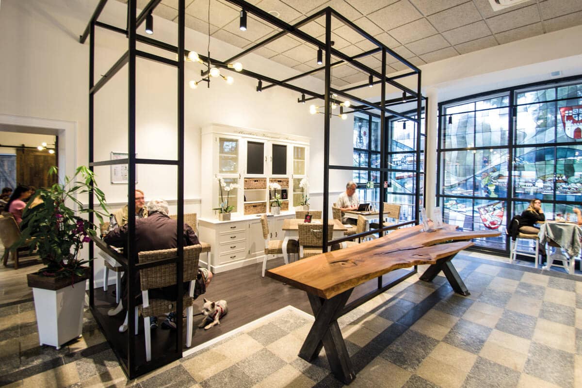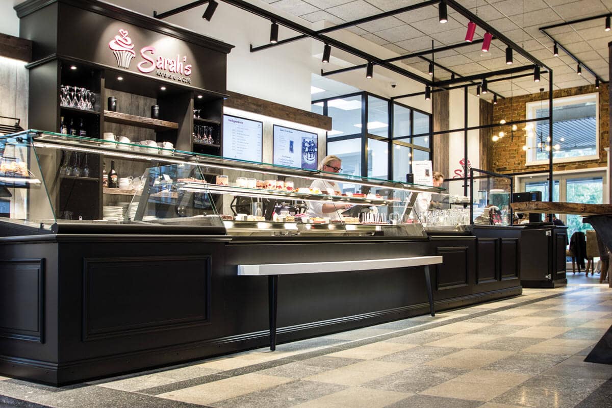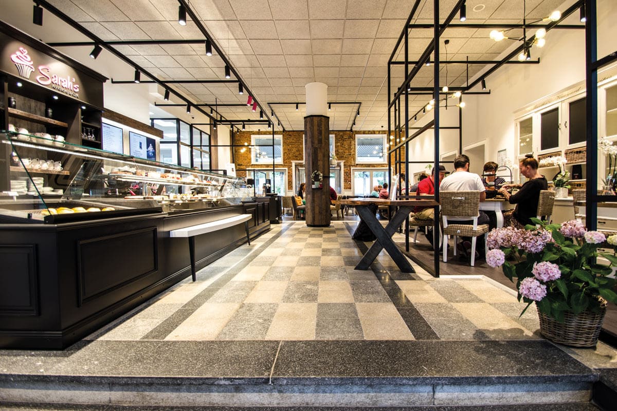 Das in die Jahre gekommene Bahnhofsgebäude in Königswinter wird zum neuen Publikumsmagnet für Anwohner und Touristen. Rund um die frischgebackene Geschäftsführerin Sarah erfüllt sich Familie Schell einen Lebenstraum und gründet in dem denkmalgeschützen Gebäude eine Konditorei mit eindrucksvollem Ambiente. Reist man in Zukunft mit der Bahn nach Königswinter, steht man gleich vor dem prächtigen Gebäude, das auch von außen grundlegend erneuert wurde. Wirft man dann einen Blick hinein, sieht man ein beeindruckendes und gleichermaßen gemütliches Café, was zum Verweilen einlädt. Prägendes Element des Gebäudes ist das denkmalgeschützte Bleifenster im Eingangsbereich des Cafés. Es ist nicht nur ein Blickfang, da es dem Raum einen unverwechselbaren Charakter gibt, sondern verkörpert auch die Verbindung zwischen Alt und Neu. Blickt man weiter durch den Raum, sieht man viele weiße und hölzerne Elemente. „Wir möchten es gemütlich haben“ war die Prämisse der ganzen Familie. Das Ergebnis ist ein moderner Landhausstil mit einem Kontrast aus rustikalen Elementen, wie Scheunentoren aus Altholz oder einer alten Backsteinwand, und eleganten Einrichtungsgegenständen, wie die komplett in dunkelgrau gehaltene Verkaufstheke. Diese bietet nicht nur Platz für 30 Torten (unter anderem auch vegane und glutenfreie Variationen), sondern verfügt auch über weitere Präsentationsflächen für Pralinen, Snacks und hausgemachtes Eis.