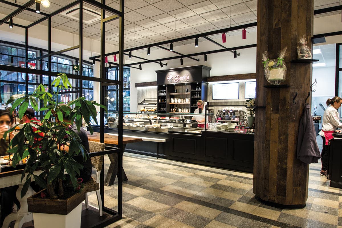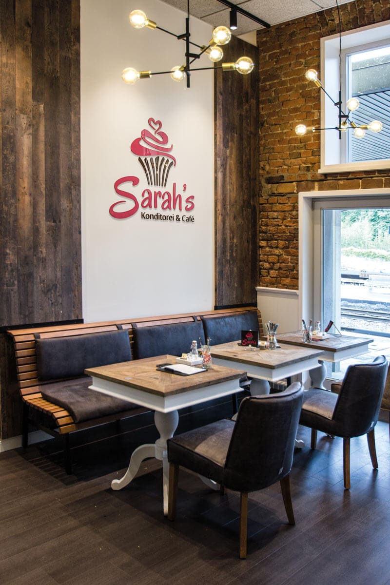 Weiterhin befinden sich im alten Wartesaal des Bahnhofs stilgerechte Raumtrenner, komfortable Bänke und zahlreiche Filamentleuchten, die den Besucher in eine Wohlfühlatmosphäre eintauchen lassen. Noch gemütlicher wird es im anschließenden Kaminzimmer. Dort kann man in einem der formschönen Ohrensessel platz nehmen oder in „Sarah‘s Lounge“ auf sogenannten Love-Seats verweilen. Wer also in Zukunft einen Ausflug zum Drachenfels oder ins schöne Königswinter plant, sollte sich einen Besuch in Sarah‘s Cafe nicht entgehen lassen.