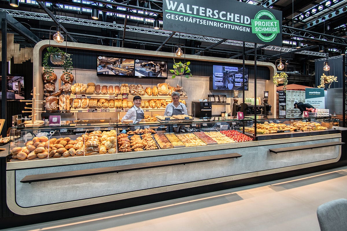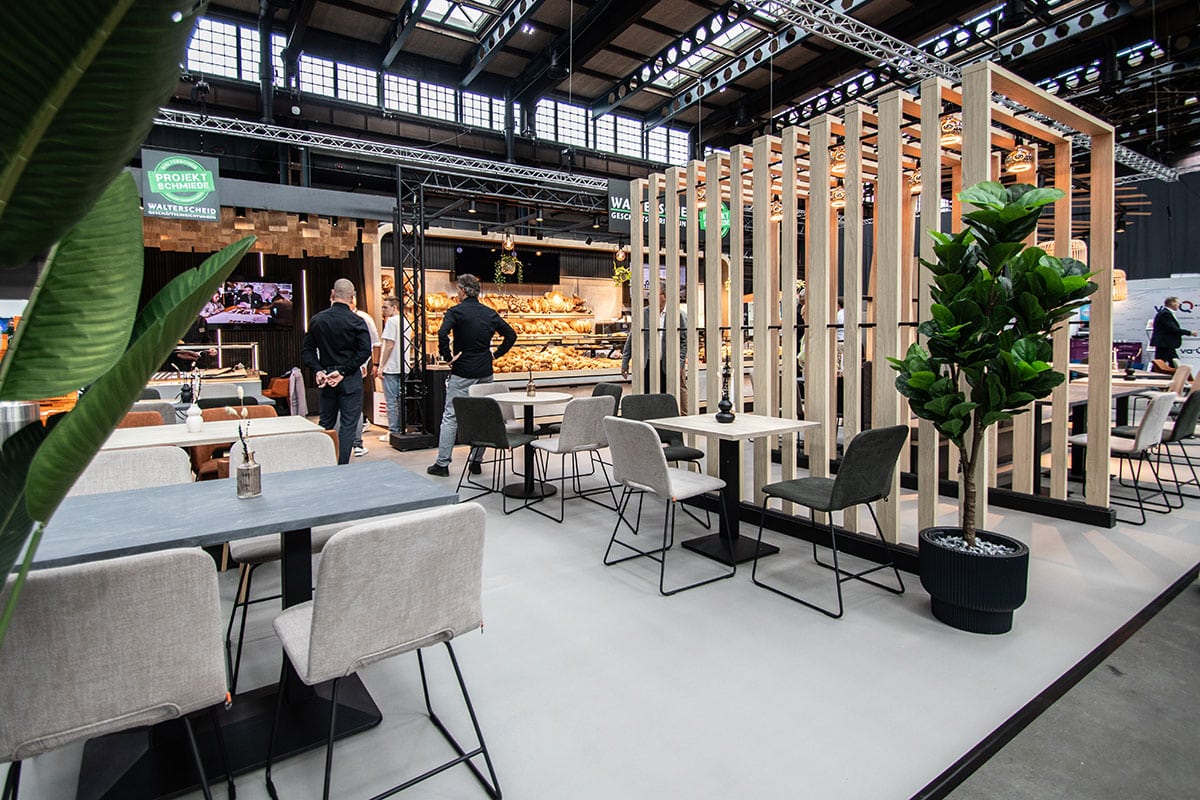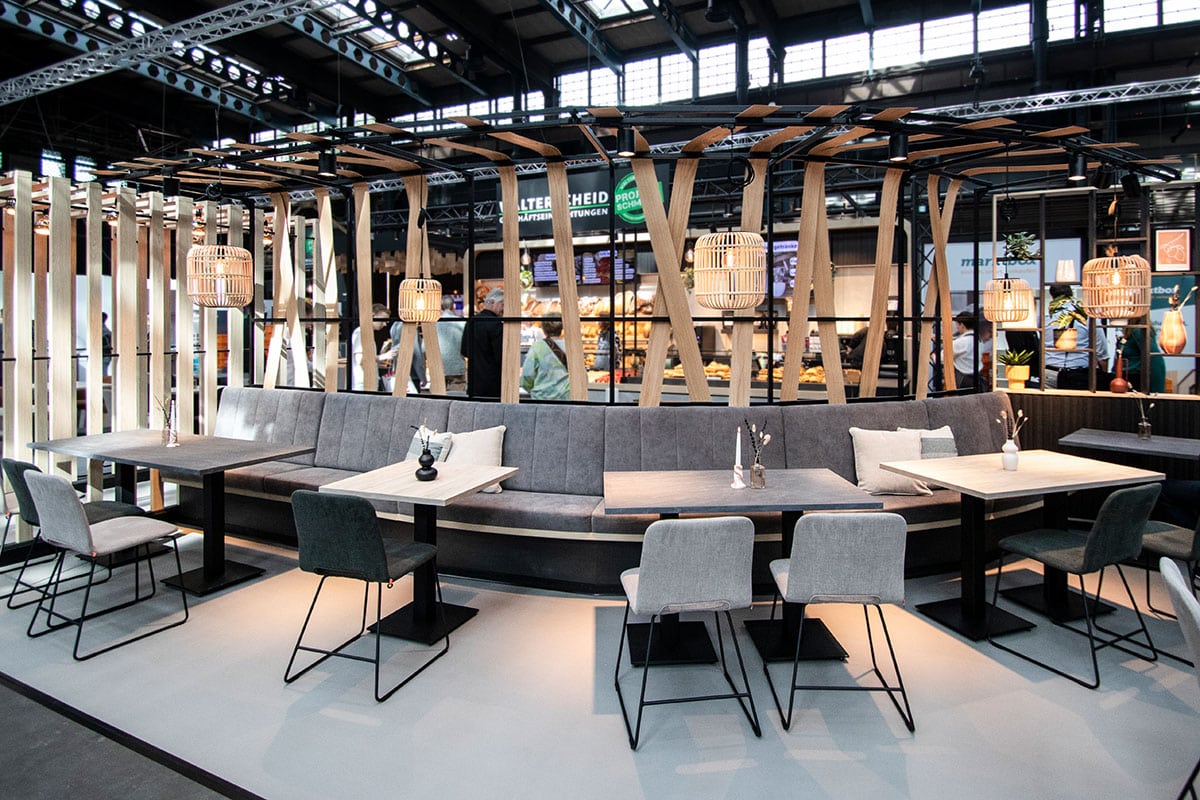 Auf dem Messestand präsentierten wir unter anderem ein neues Thekendesign mit minimalistischen Stützen, dezenter Lichtblende sowie neu gestaltete Brotroste mit transparenter Glasrehling für optimale Wareneinsicht. Die Materialien – schlichtes Eichenholz, natürlich anmutende Steinplatten und speziell durch die Projektschmiede entwickelte Designplatten in Leistenoptik – verliehen dem Café eine elegante und ausdrucksstarke Erscheinung. Ein besonderes Highlight war die sieben Meter lange, abgerundete Polsterbank mit einem abstrakten Raumtrennelement aus gebogenen Eichenfurnierstreifen. Diese halbtransparente Konstruktion war ein echter Blickfang und schuf eine angenehme Wohlfühlatmosphäre.