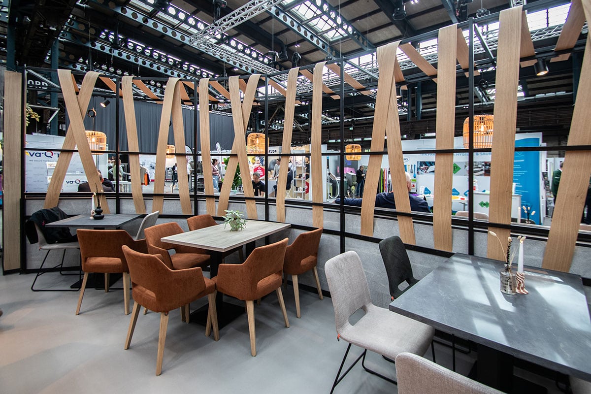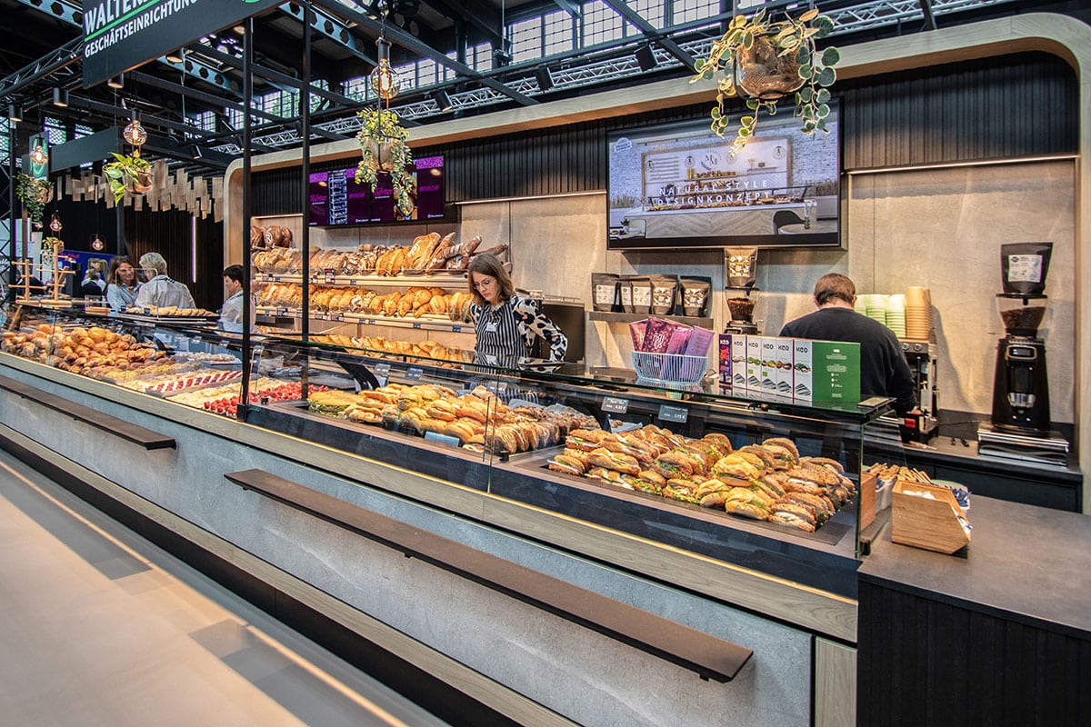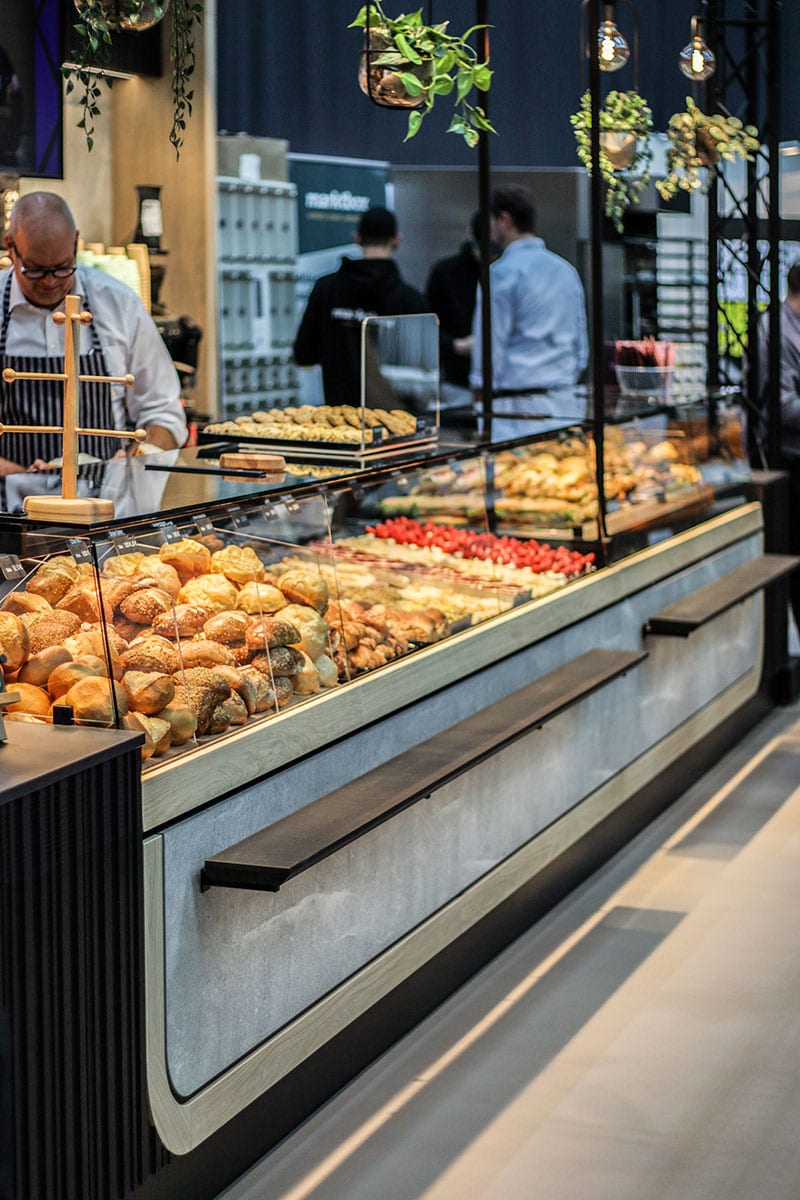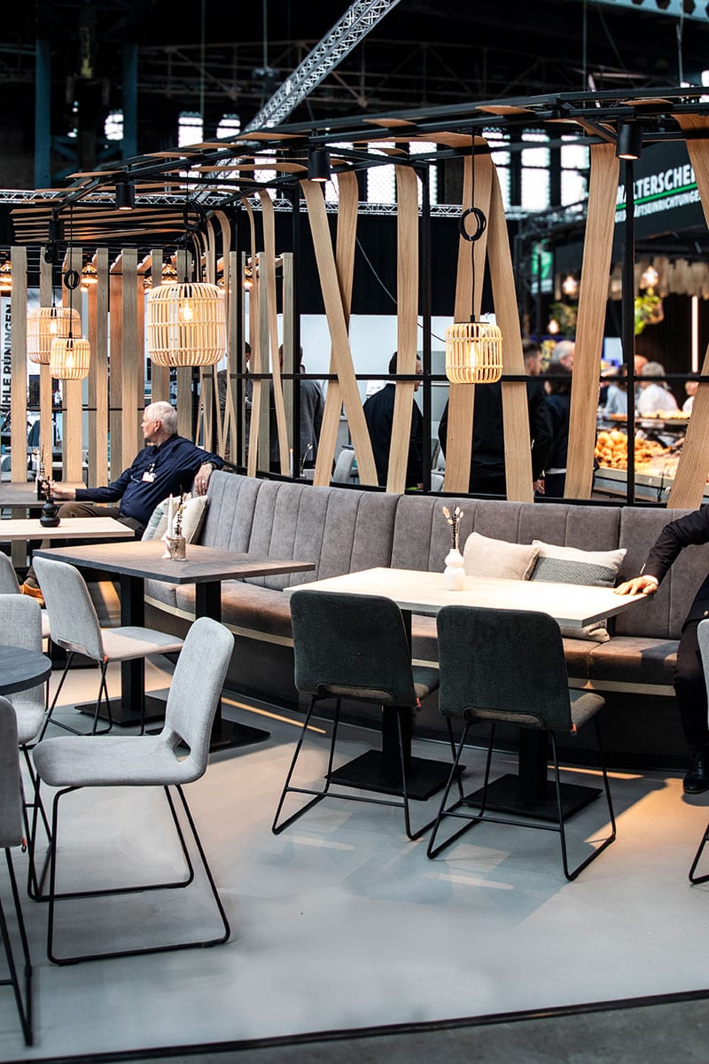 Auf dem Messestand präsentierten wir unter anderem ein neues Thekendesign mit minimalistischen Stützen, dezenter Lichtblende sowie neu gestaltete Brotroste mit transparenter Glasrehling für optimale Wareneinsicht. Die Materialien – schlichtes Eichenholz, natürlich anmutende Steinplatten und speziell durch die Projektschmiede entwickelte Designplatten in Leistenoptik – verliehen dem Café eine elegante und ausdrucksstarke Erscheinung. Ein besonderes Highlight war die sieben Meter lange, abgerundete Polsterbank mit einem abstrakten Raumtrennelement aus gebogenen Eichenfurnierstreifen. Diese halbtransparente Konstruktion war ein echter Blickfang und schuf eine angenehme Wohlfühlatmosphäre.