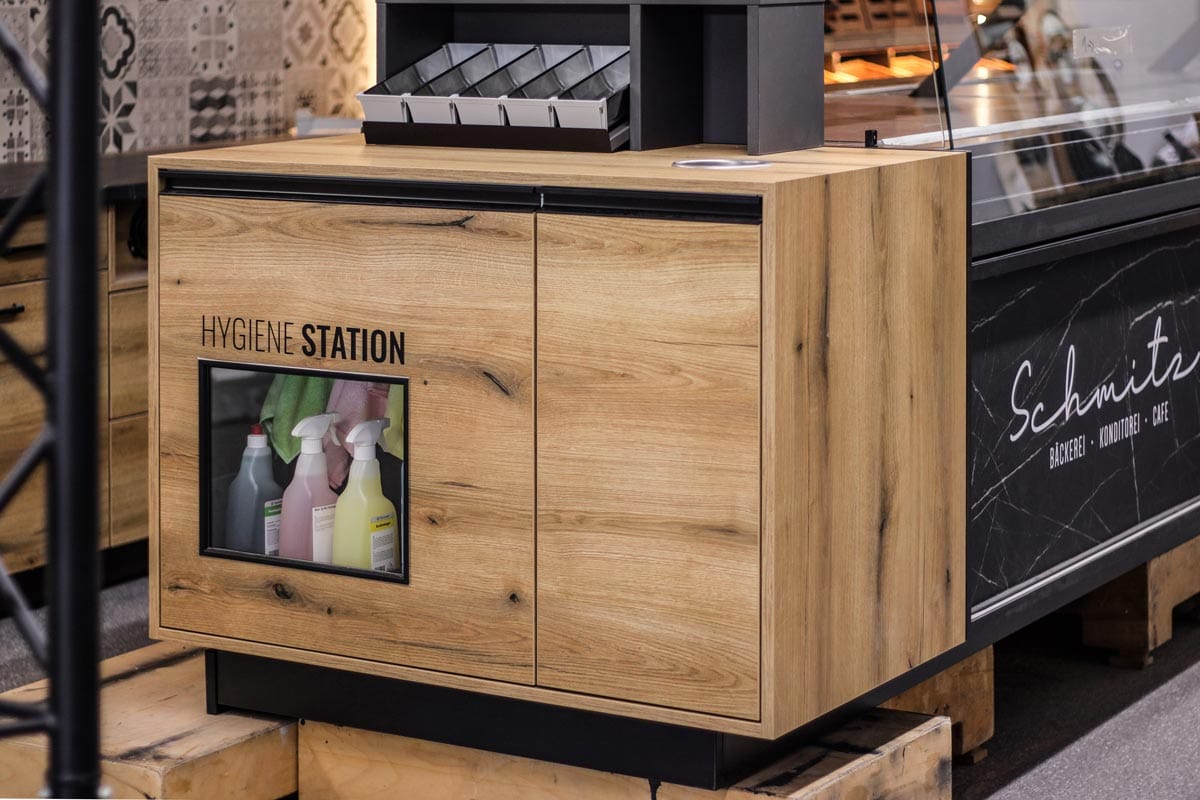 • Eine innovative Selbstbedienungstheke mit verschiebbarer Hygienescheibe, Massivholz-Tablettrutsche und drehbarer Preisauszeichnung zur einfachen Bedienung