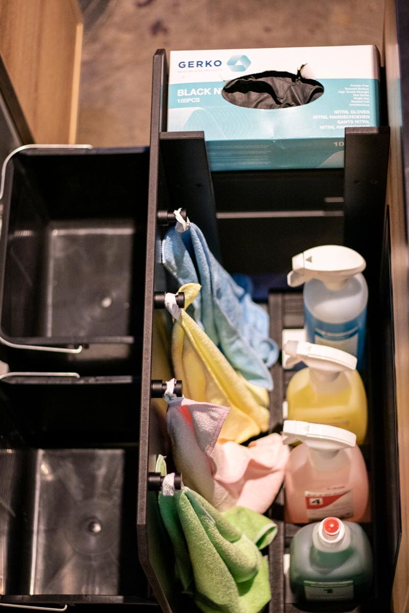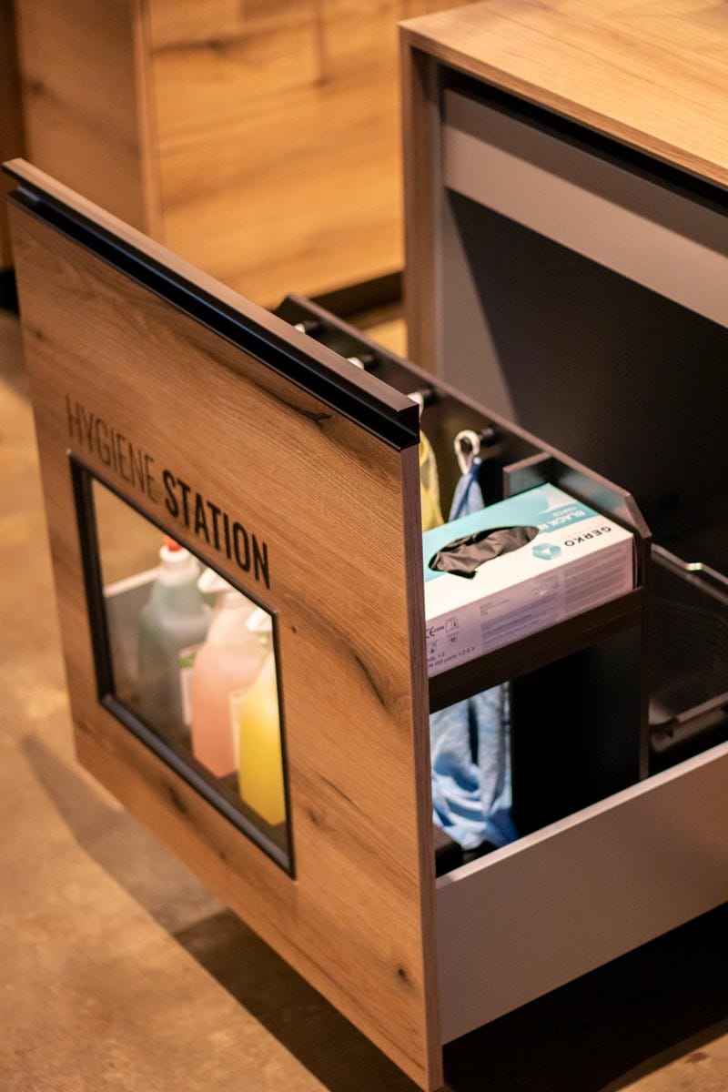 • Eine zentrale Hygienestation mit organisierten Stellplätzen für Reinigungsmittel, dazu passenden Tüchern, Handschuhen, Eimern etc.